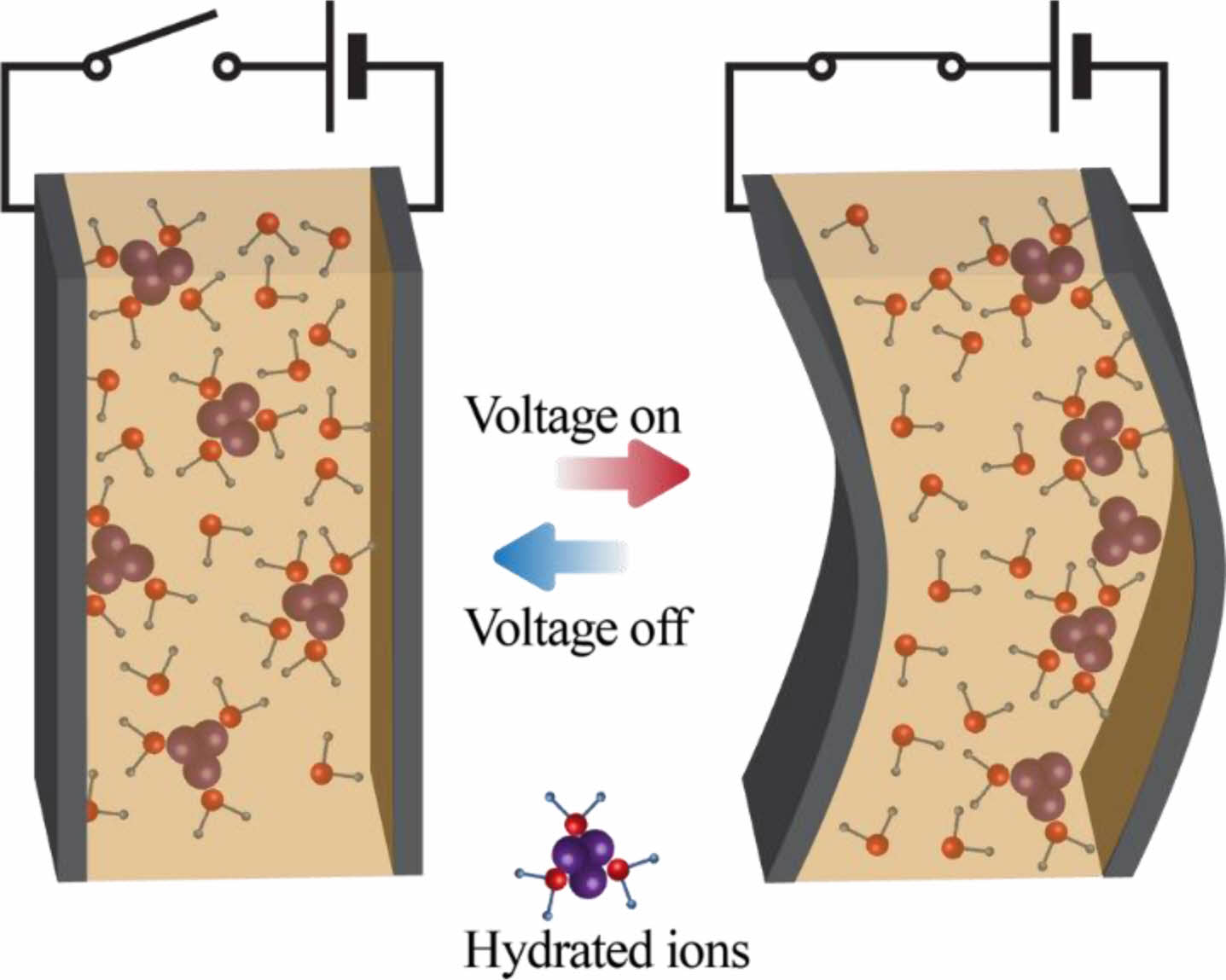 이온성 고분자-금속 복합물(ionic polymer-metal composite, IPMC)은 정전기력에 의해 구동되는 생체 모방형 구동체(biomimetic actuator) 소재로써 가벼운 무게와 빠른 응답속도, 낮은 전압에서 우수한 구동력으로 인해 각광받고 있다.1-3 또한 인공근육을 비롯한 인공심장, 스마트 피부 등의 여러 분야에서 적용이 가능하기 때문에 많은 연구가 이루어지고 있다.4-10 IPMC는 Pt와 같은 금속전극을 이온교환막의 표면에 도금함으로써 제작할 수 있으며, Figure 1과 같이 IPMC 구동체의 양쪽 표면전극에 전위차를 인가하면, 수화된 이온교환막 내부의 양이온 클러스터들은 전기삼투현상에 의해서 물과 함께 음극으로 이동하게 되고, 이 때 양극의 수축과 음극의 팽창으로 인해 IPMC 구동체의 기계적 굽힘이 발생한다.11-15 최근 나노분산된 전극을 IPMC에 도입하면 큰 표면적과 높은 정전용량으로 동일한 전위차에서 수화된 이온을 끌어들이고 이온 수송을 촉진하는 데 유리하여 IPMC 구동체의 구동변위와 성능을 모두 개선시킬 수 있다고 보고되고 있다.16-20