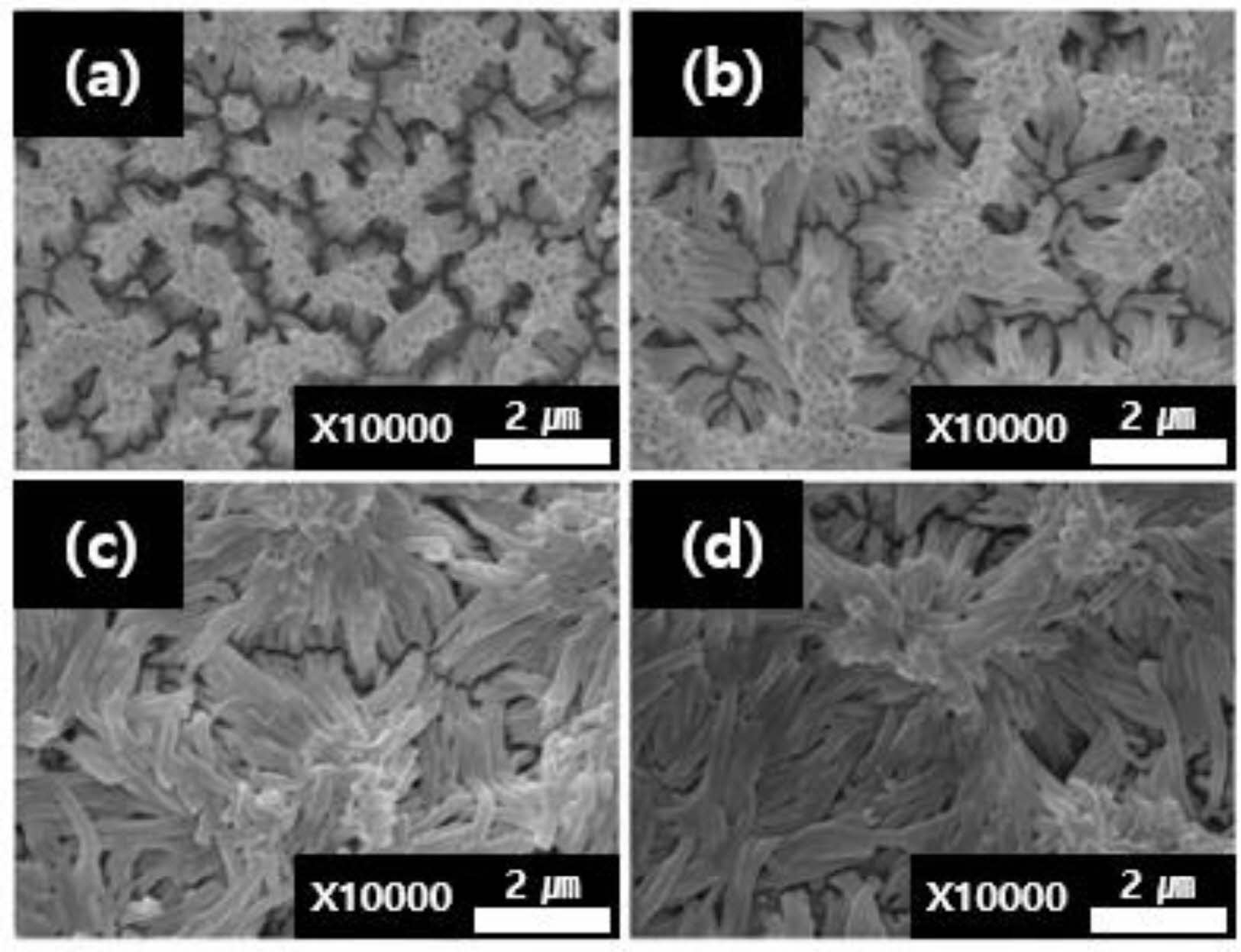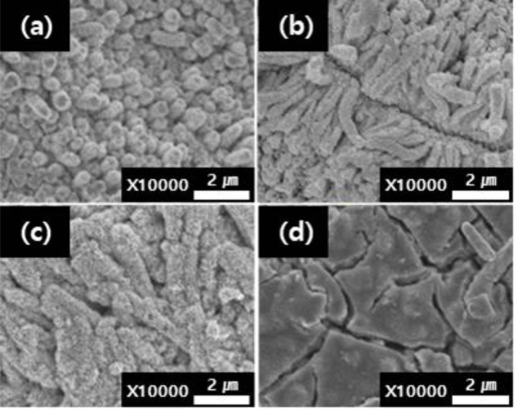 나노기둥 구조의 IPMC 표면분석.나노기둥 구조가 도입된 Nafion 이온교환막 양쪽 면에 무전해 도금법으로 Pt를 환원시켜 IPMC를 제조하였다. TIL법으로 1, 2, 4, 8시간에 따라 나노기둥 구조가 도입된 Nafion 이온교환막을 이용하여 제조된 IPMC의 표면을 Figure 5에 나타냈다. Figure 5(a)와 (b)에서 확인할 수 있듯이, 짧은 시간의 TIL법으로 제조한 Nafion 이온교환막을 이용하여 IPMC를 제조할 경우 Nafion 이온교환막 표면에 등방성 나노기둥 구조의 Pt 전극이 대면적으로 고르게 생성되어 있음을 확인할 수 있었다. 이는 무전해 도금이 수용액 상에서 화학적인 방법으로 제조됨에 따라 Nafion 이온교환막 표면에서 일정 길이 이하로 제조된 나노기둥은 수용액 상에서 나노기둥 간의 모세관 접착력이 감소되었기 때문에 뭉침 현상이 감소된 것으로 판단된다. 또한 Nafion 이온교환막의 나노기둥 표면에 Pt가 그대로 도금되고, 결과적으로 Pt의 단단함(stiffness) 때문에 뭉침 현상이 감소된 것으로 판단된다. 하지만, Figure 5(c)와 (d)에서 확인할 수 있듯이, 4시간 이상 TIL법을 이용하여 나노기둥 구조가 도입된 Nafion 이온교환막으로 제조한 IPMC는 나노기둥 구조를 유지하지 못하였으며, Pt가 무전해 도금된 뒤에도 서로 뭉쳐지거나 무너진 채로 환원되어 전극을 이루고 있는 것을 확인할 수 있었다. 이것은 Pt가 IPMC의 전극으로 환원되었지만, 나노기둥 높이가 길어져서 Nafion 이온교환막의 자체 탄성률을 버티지 못하고 무너진 것으로 판단된다. 더욱이 Figure 5(d)에서 확인할 수 있듯이, 8시간 TIL법으로 나노기둥 구조가 도입된 Nafion 이온교환막을 이용하여 제조된 IPMC의 표면은 Pt 전극이 뭉친 상태이며, 수많은 크랙들이 발견되었다. 이것은 나노기둥 높이가 너무 길어 Nafion 이온교환막의 자체탄성률을 버티지 못하고, 무전해 도금의 수용액 상에서도 분리되지 않으며 뭉쳐져 무너진 상태 그대로 Pt 전극이 환원된 것으로 판단된다.