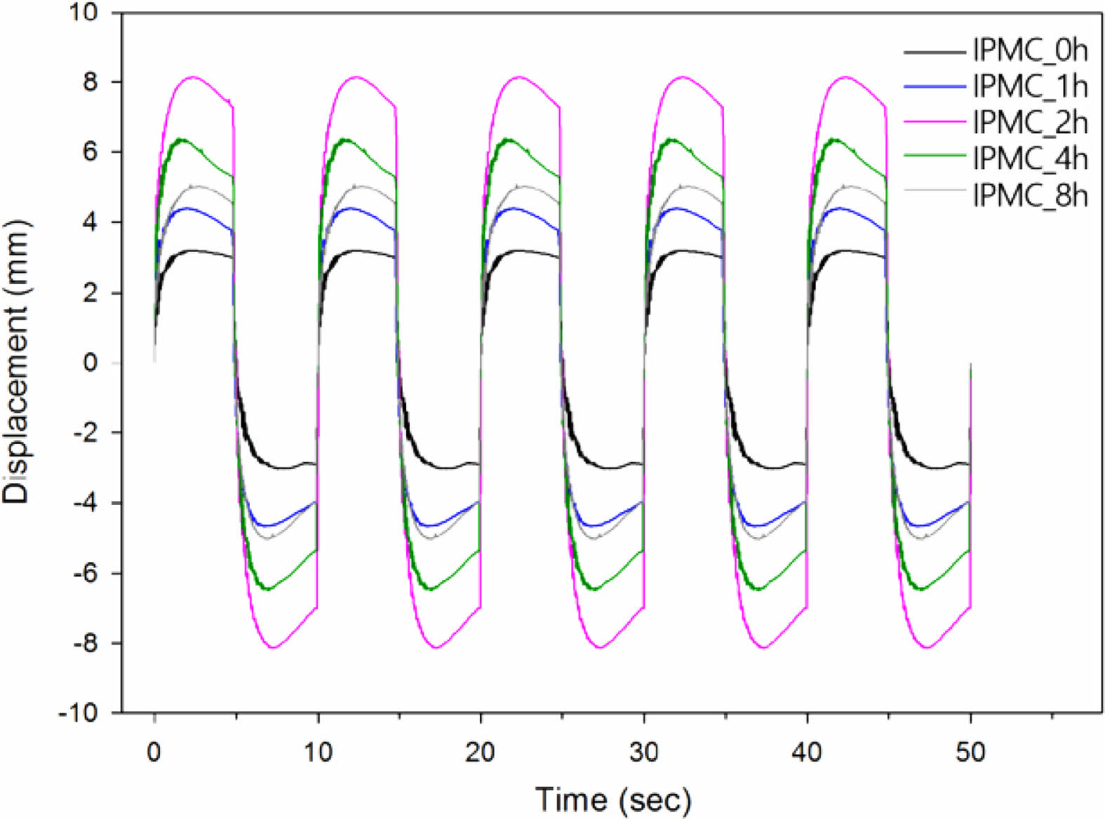 Figure 6 Time-displacement curves of IPMCs recorded for 50 s under AC 1 V and 0.1 Hz. IPMCs were prepared with Nafion membrane and thermally nanorod-imprinted Nafion membrane for different time: 0, 1, 2, 4, 8 h, respectively. |