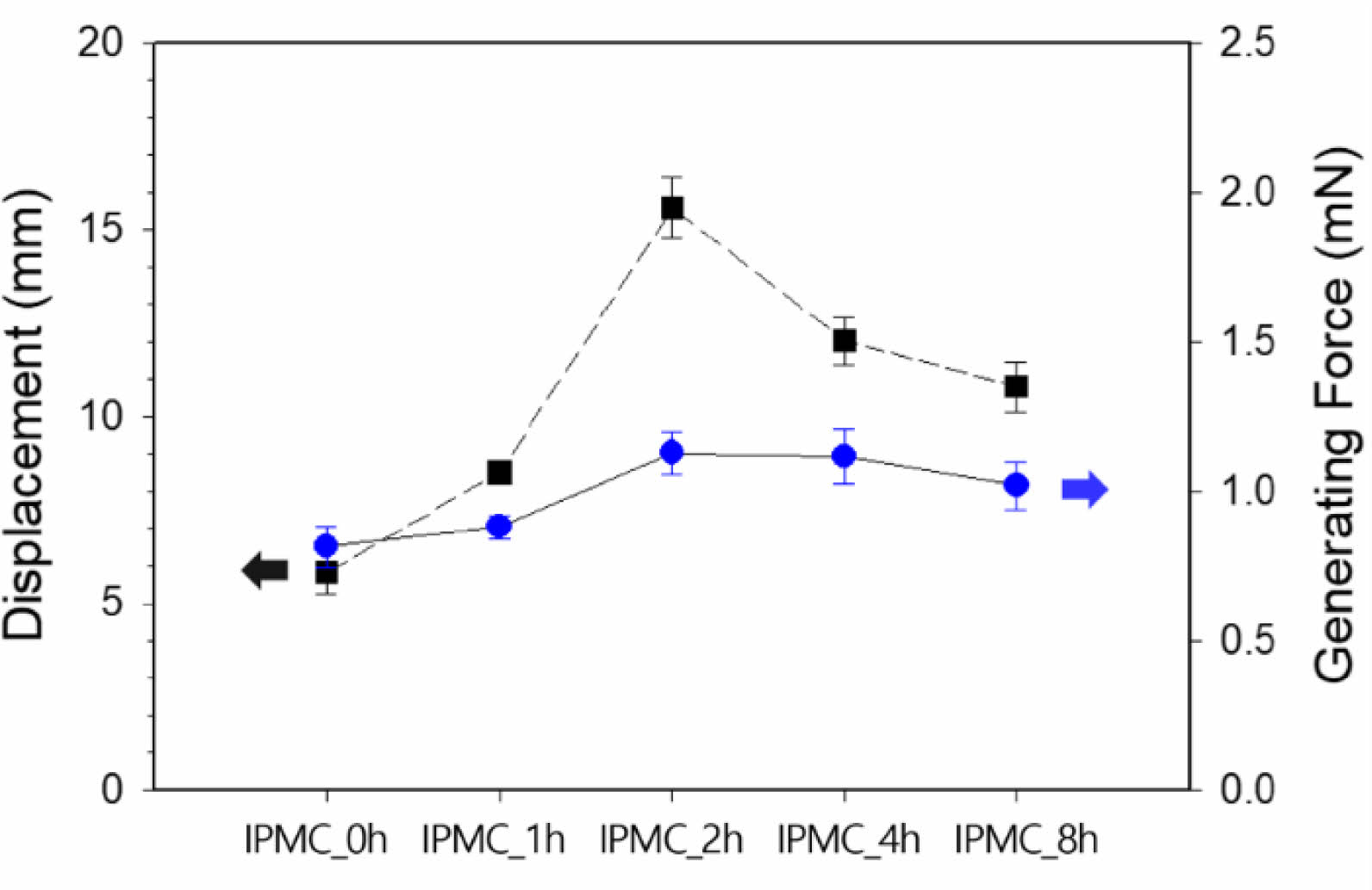 Figure 7 Maximum time-displacements of IPMCs recorded under an applied alternative current (AC) of 1 V at a frequency of 0.1 Hz and maximum blocked force of IPMCs under an applied direct current (DC) of 1 V. |