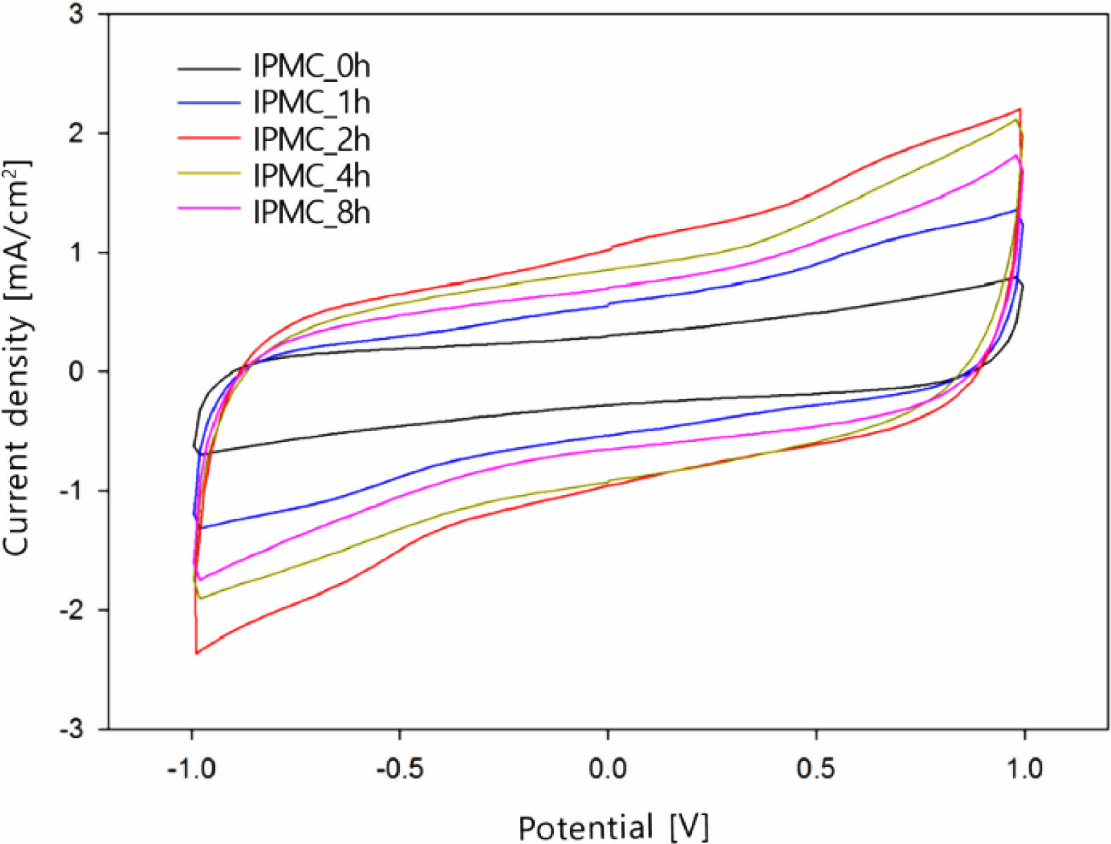 Figure 8 CV curves of IPMCs prepared with Nafion membrane and thermally nanorod-imprinted Nafion membrane for different time: 0, 1, 2, 4, 8 h, respectively. |