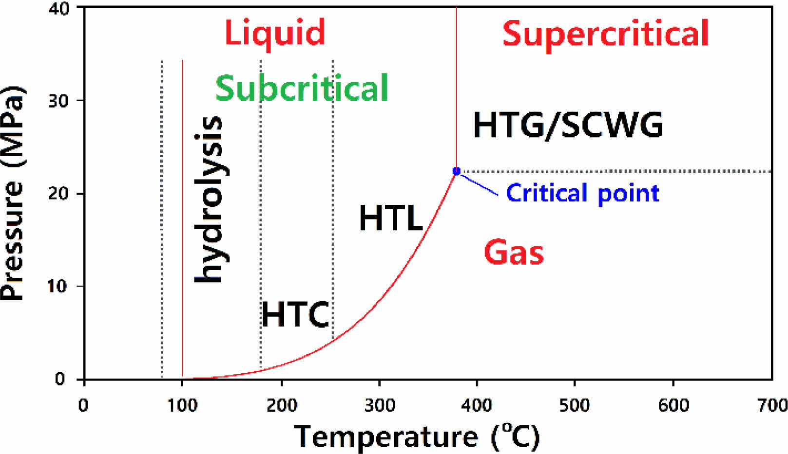 물, 메탄올, 에탄올과 같은 용매를 초임계나 아임계 상태에서 폐플라스틱과 혼합하여 처리하면 비교적 낮은 온도(350-450 oC)에서 분해 반응이 일어나서 저 분자량의 유분을 얻을 수 있다. 물은 임계점(critical point)이 373.9 oC, 22.12 MPa로 임계점 이상의 온도는 초임계 상태, 100 oC에서 임계점 이하는 아임계 상태(subcritical state)라고 부른다(Figure 1). 열수 처리는 처리 온도에 따라 열수액화(hydrothermal liquefaction) 및 열수가스화(hydrothermal gasification) 및 수열 탄화 (hydrothermal carbonization, HTC)의 세 가지로 나뉜다(Figure 1).