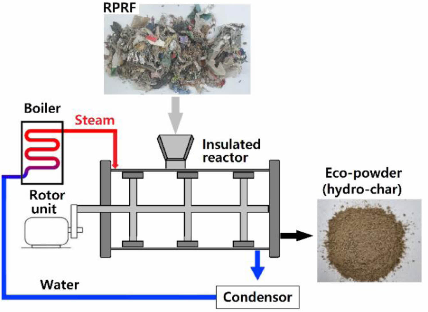 수열 탄화(Hydro-thermal Carbonization). RPRF를 210 oC 포화 수증기(2.3 MPa)로 1시간 수열 탄화(HTC)시켜 hydro-char를 제조하였다. 사용된 반응기는 ㈜그린 환경에서 생산 설비로 사용하는 반응기로 6000 L 규모이다. Figure 2에 수열 탄화 공정을 나타낸 개략도를 나타냈다. RPRF를 단열이 유지되는 반응기에 넣은 후 반응기를 닫고 수증기 밸브를 열어 보일러에서 형성된 210 oC, 2.4 MPa의 포화 수증기를 반응기에 가한다. 1시간 교반 후 수증기 밸브를 잠그고 release 밸브를 열어 수증기를 제거하여 압력을 상압으로 낮춘 후 반응기를 열어 처리된 hydro-char를 꺼낸다. 반응기에서 나온 직후의 hydro-char는 습기를 다량 포함한 축축한 상태이지만 상온에서 하루 정도 방치하면 건조가 되었다. 실험에 쓰인 hydro-char는 80 oC 온풍건조기에서 24시간 건조 후 사용하였다. 제조된 hydro-char는 Figure 2에 나타낸 바와 같이 분말 형태로 향후 에코 분말로 칭한다.