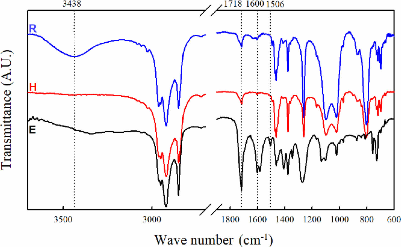 Figure 3 FTIR spectrum of Eco-powder. R: soluble fraction of ecopowder in xylene at room temperature, H: soluble fraction of ecopowder at 130 oC, E: Eco-powder. |