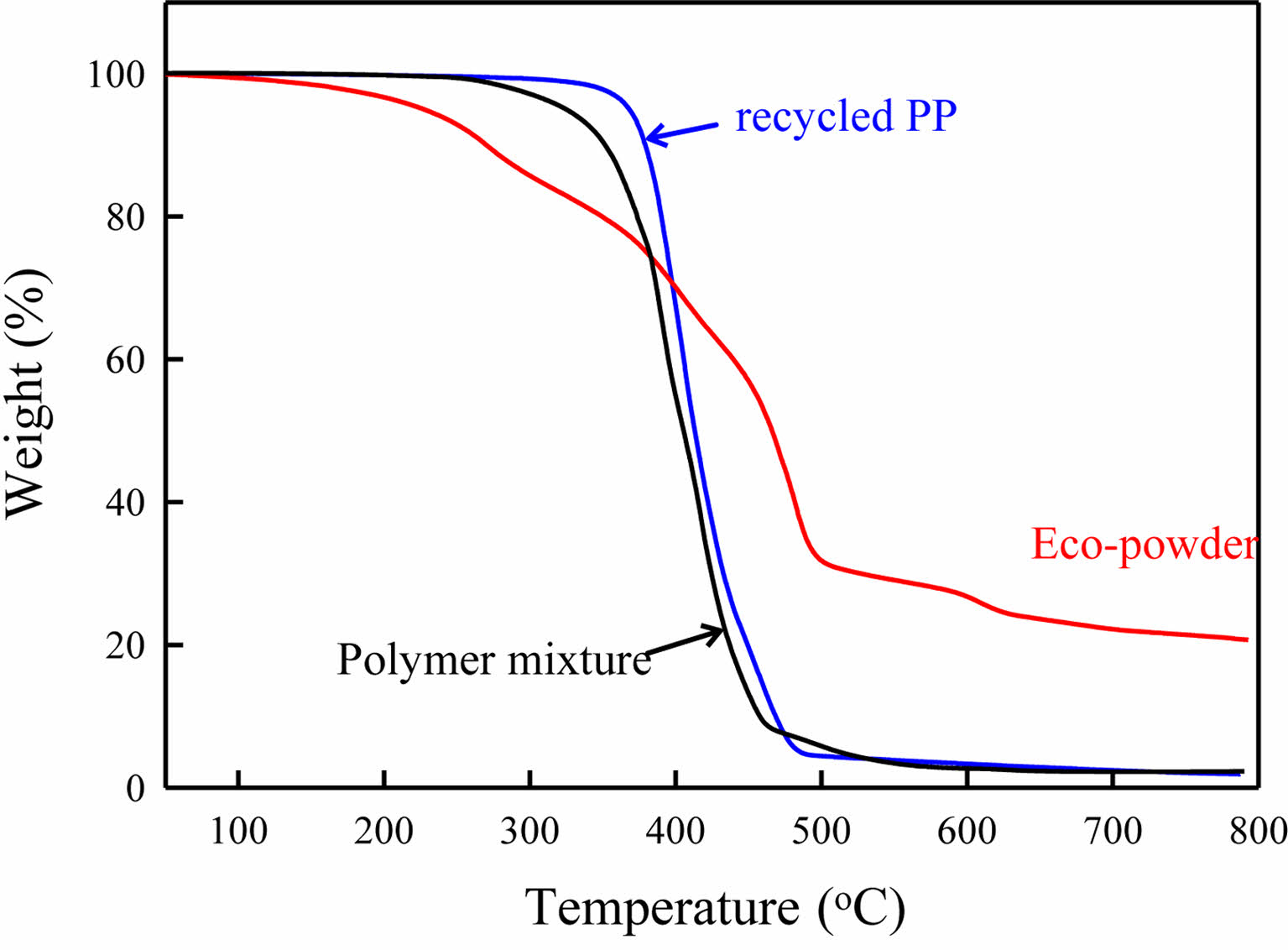 Figure 4 Thermogravity analysis (TGA) results of Eco-powder, polymer mixture and rePP. Polymer mixture is mixture of 5 different commercial polymers (PP, HDPE, PS, PA6, PET) in equal amount. |