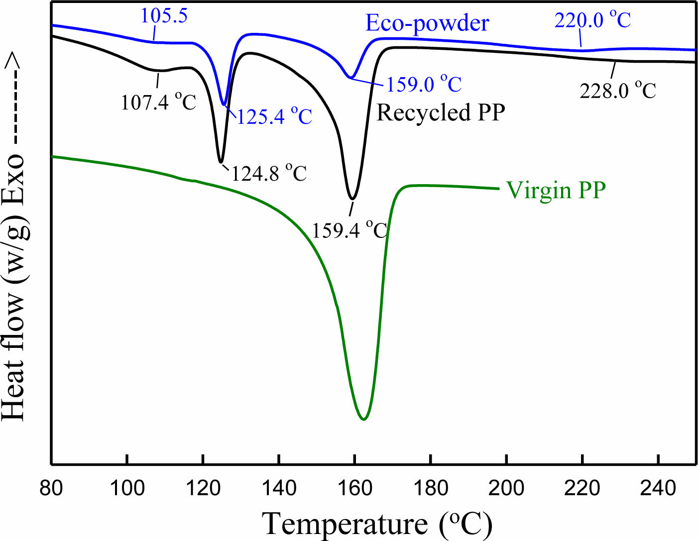 Figure 5 DSC heating thermogram of eco-powder, rePP and virgin PP. |