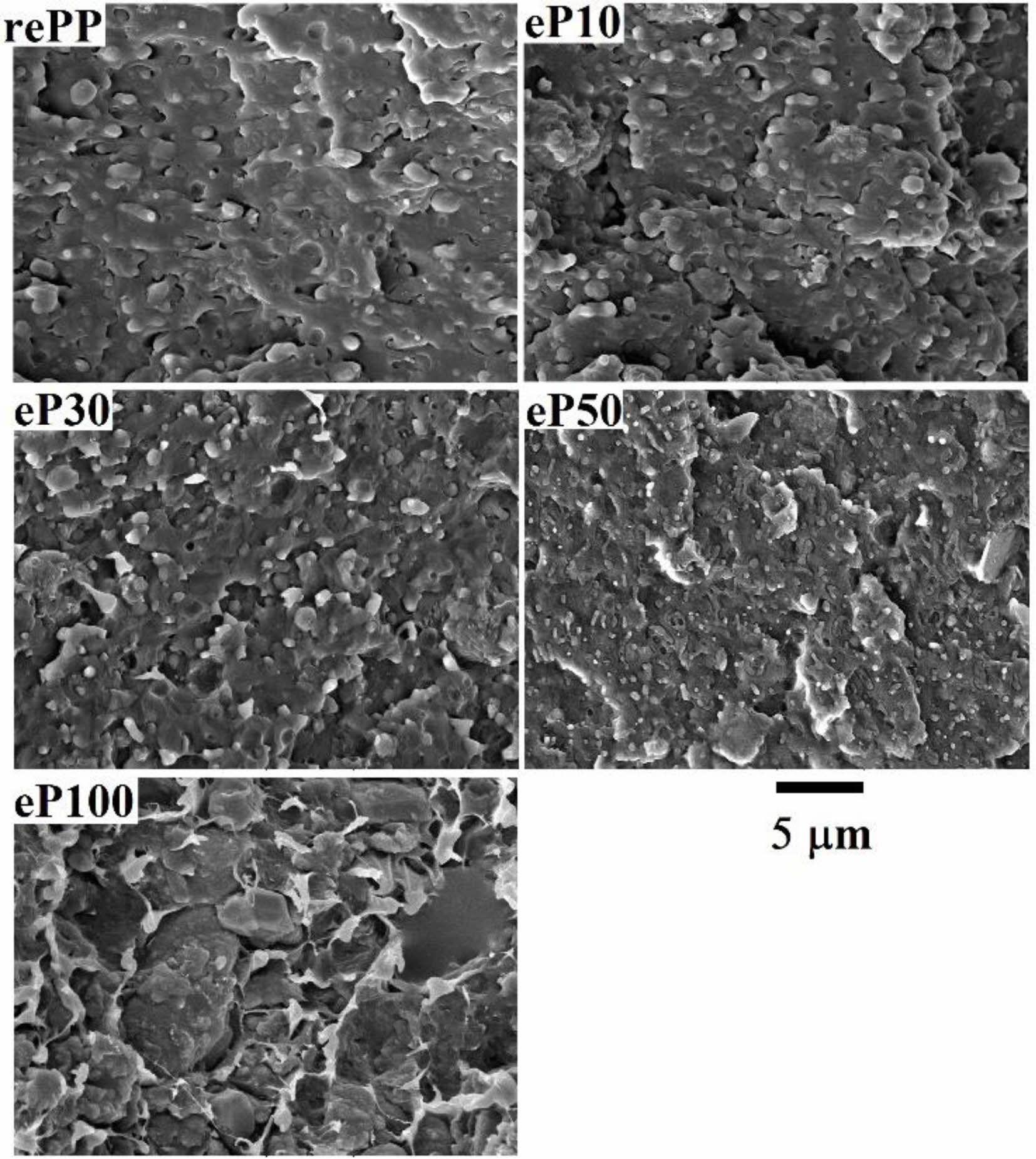 Figure 6 SEM micrograph of rePP, eco-powder and their blends: recycled PP, eP10: eco-power/rePP (10/90), eP30: eco-power/rePP (30/70), eP50: eco-power/rePP (50/50) and eP100: eco-power. |