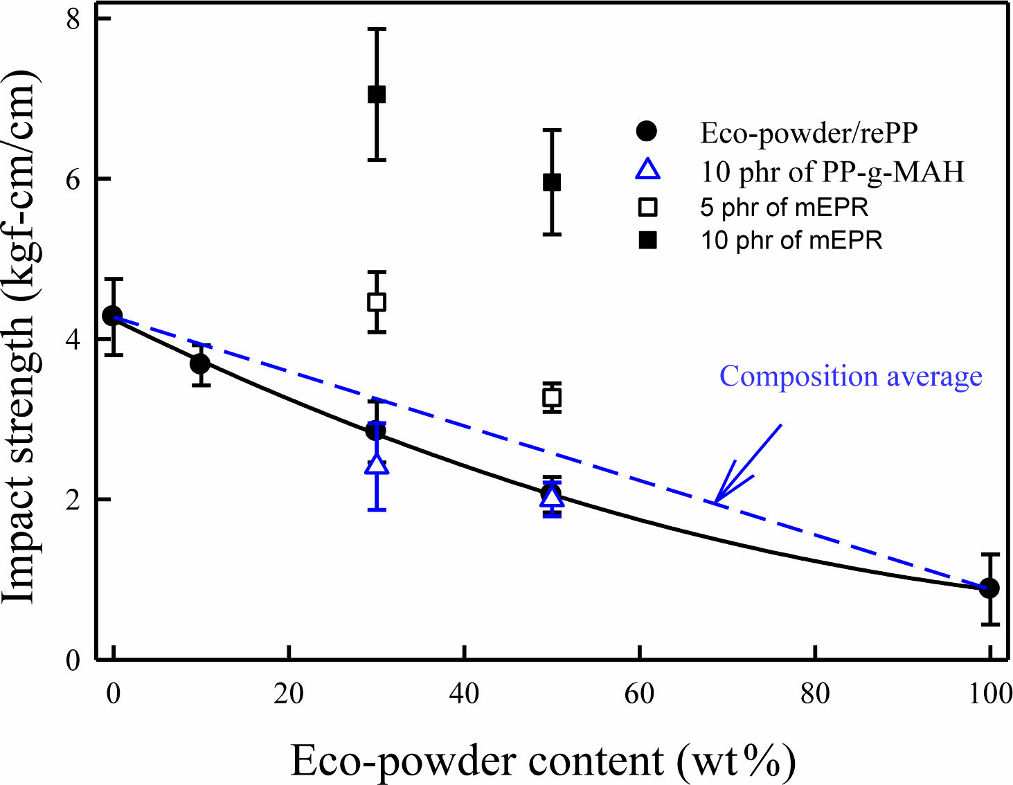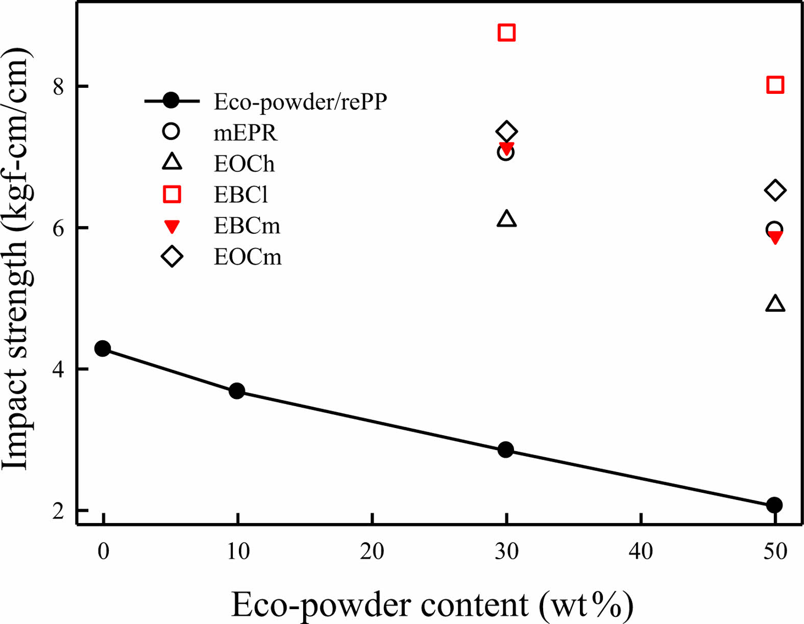 Figure 10 Impact strength of eco-powder/rePP/elastomer blends. The content of elastomer in the blends is 10 phr. |