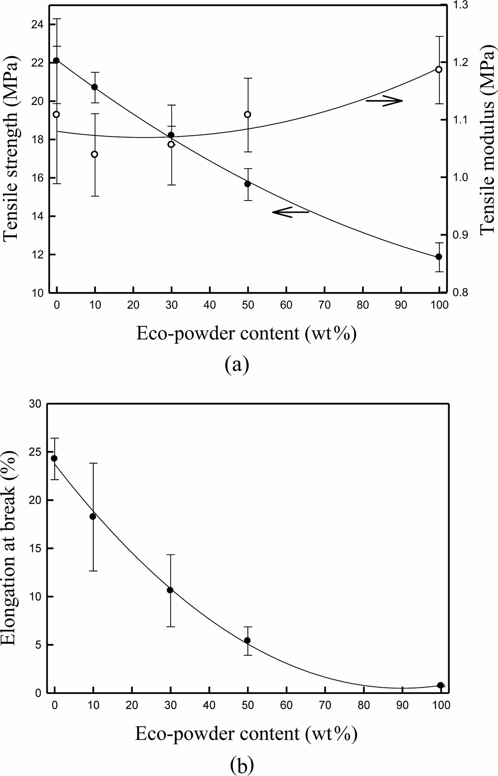 Figure 9 Tensile properties of eco-powder/rePP blends: (a) tensile strength and tensile modulus; (b) elongation at break. |