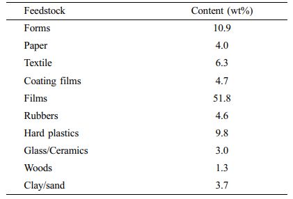 Zhao등은 전자제품과 자동차에서 직접 채취한 폐 내충격 폴리스티렌(high impact polystyrene, HIPS), acrylonitrile-butadiene-styrene(ABS), 폴리카보네이트(polycarbonate, PC), 폴리프로필렌(polypropylene, PP) 및 폴리아마이드 6(polyamide 6, PA 6)을 250-350 oC의 범위에서 열수액화 처리하였다.14 처리 온도가 올라갈수록 고형분 함량은 감소하였다. 350 oC에서는 PP를 제외한 다른 네가지 고분자는 80% 이상이 유분과 가스로 변하였다. 남은 고형분은 형태는 유지하였지만 온도가 높아질수록 부스러지기 쉬운 상태였고 탄화가 많이 진행되어 진한 갈색을 띄었다.