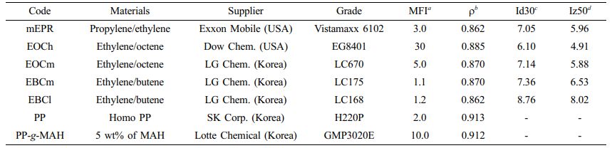 사용된 5종의 충격보강제는 모두 PP의 충격 향상에 사용되는 제품으로 공단량체의 농도 및 분자량이 충격강도 증가에 영향을 미치는 것으로 보고되있다. 일반적으로 공단량체의 함량이 높고 분자량이 높을수록 충격 강도 개선 효과가 높은 것으로 알려져 있다. 가장 충격강도 개선이 큰 충격보강제는 EBCl로 밀도가 0.862 g/cm3으로 mEPR과 함께 밀도가 가장 낮았다. mEPR은 밀도가 가장 낮은 편이었지만 MFI 값에서 유추할 수 있듯이 분자량 EBCl보다 낮아서 충격강도 개선 효과가 떨어지는 것으로 보인다.
