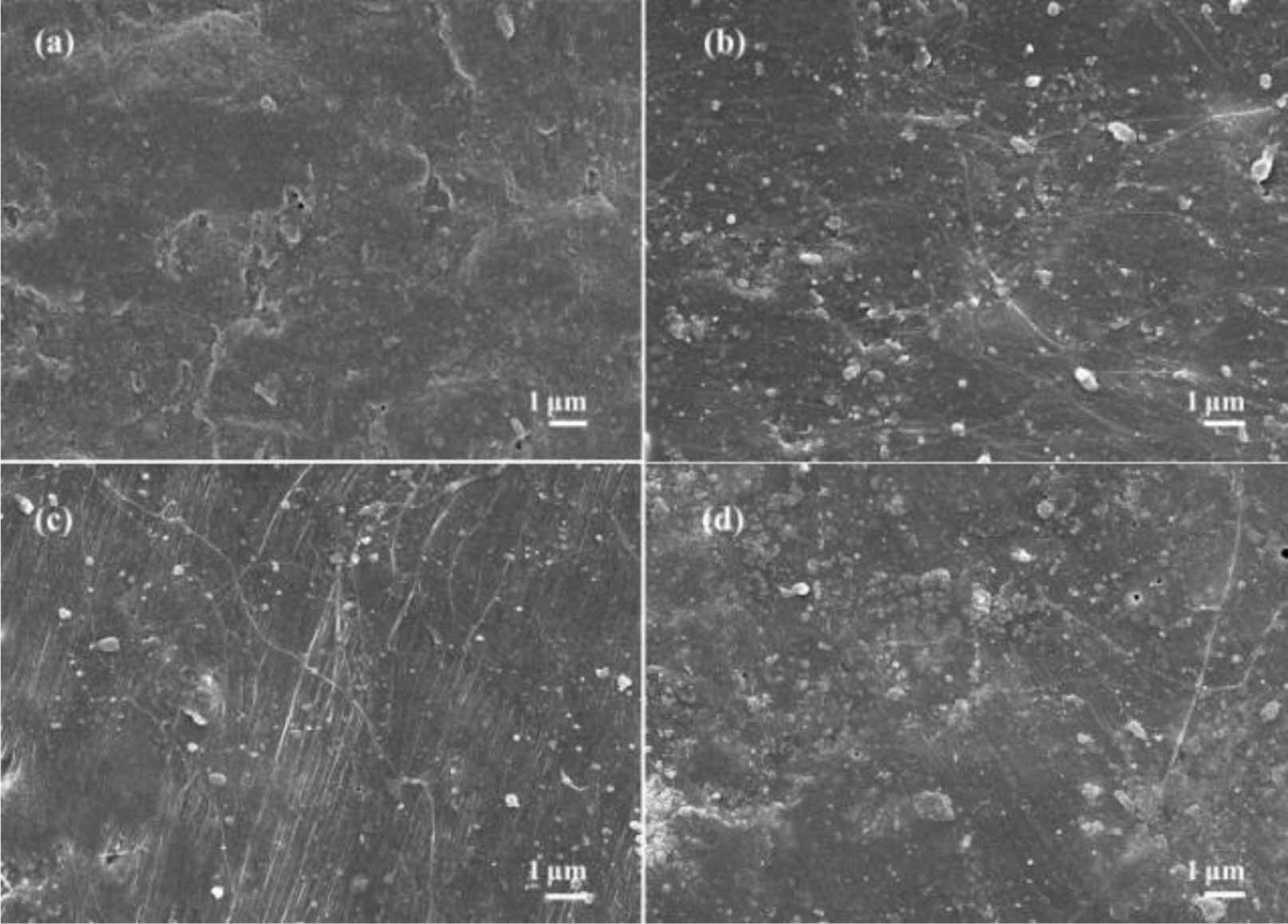 The surface of the cryogenically fractured composite sample in liquid nitrogen was measured using a Hitachi S-4300 model (Japan) scanning electron microscope (SEM) at an accelerating voltage of ~15 kV. To improve resolution, the surface of the sample was coated with platinum using an SPI sputter coater.