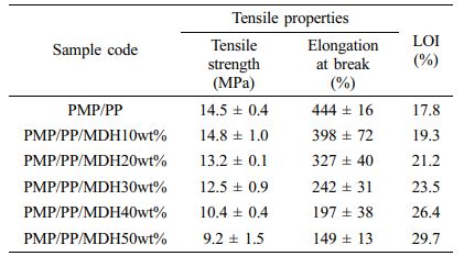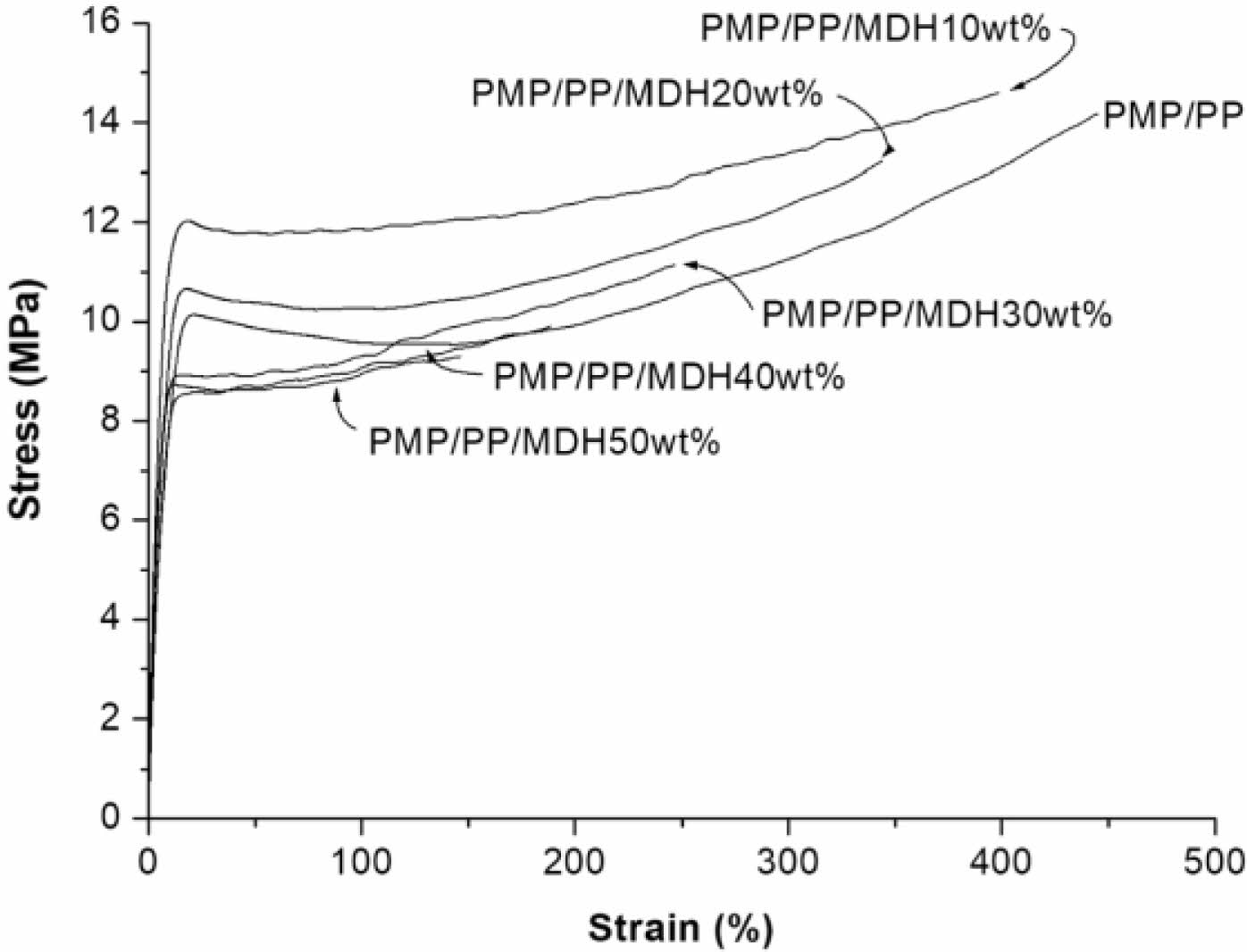 Fire and Tensile Behavior of Composites. The tensile and LOI test results of the PMP/PP/MDH composites with different MDH contents are summarized in Table 1 and the stress-strain plots are obtained from the tensile test of composites as shown in Figure 3. In Table 1, the abbreviation of the sample code, for example, PMP/PP/MDH10wt% means that the content of MDH in PMP/PP is 10 wt%.