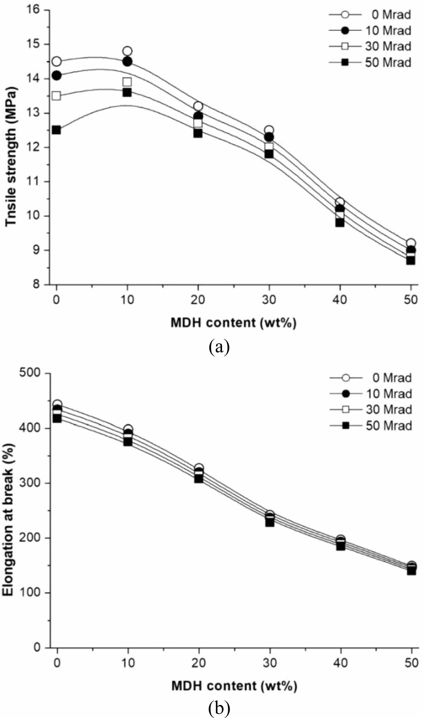 Figure 4 summarizes the effect of the EB-irradiation on the tensile properties of PMP/PP/MDH composites. It can be seen that tensile strength (Figure 4(a)) and elongation at the break (Figure 4(b)) of EB-irradiated samples was slightly decreased upon EB-irradiation. In the case of PMP/PP/MDH50wt%-50Mrad, an approximately 6.4% decrease in the elongation at the break of 140% was observed relative to that of PMP/PP/MDH50wt%. The decreased tensile properties of the EB-irradiated samples may be explained by the scission of macromolecular chains induced by EB-irradiation.12