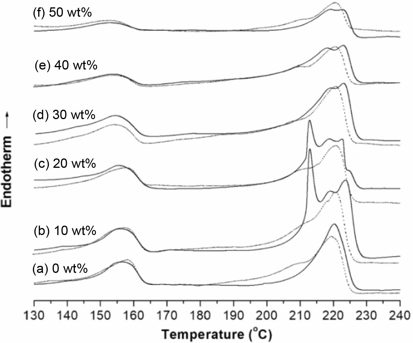 The shoulder peak of the PMP phase in the first-scan DSC thermogram of unfilled the PMP/PP almost disappeared in the second-scan DSC thermogram. The shoulder of the PMP phase in the first-scan heating curve is due to the defective crystals initially formed during the quenching process. Crystals with these defects will suffer perfection in the slow cooling step. In sharp contrast all second-scan DSC curves of the PMP phase in the composites showed multiple melting behaviors. As shown in Figure 5(b), the second-scan DSC thermogram of the PMP phase in PMP/PP/MDH10wt% exhibited three distinct peaks. In the case of PMP/PP/MDH20wt%, its melting peak was split into four peaks at approximately 212.3, 212.8, 222.9 and 225.1 °C. The low-, middle-, and high-temperature peaks are ascribed to the melting of the crystals with two distinct lamellar populations.13 It may be related to the nucleating effect of the fillers, which facilitated the formation of imperfect crystals on the surfaces of the fillers, and the perfect crystals were phase-separated during the slow cooling procedure. As the MDH content increased (> 30 wt%) the low-melting peak disappeared, and two distinct endotherms remained. This indicates that such fillers hinder the rearrangement of meta-stable polymer chains for crystallization when there are too many fillers.