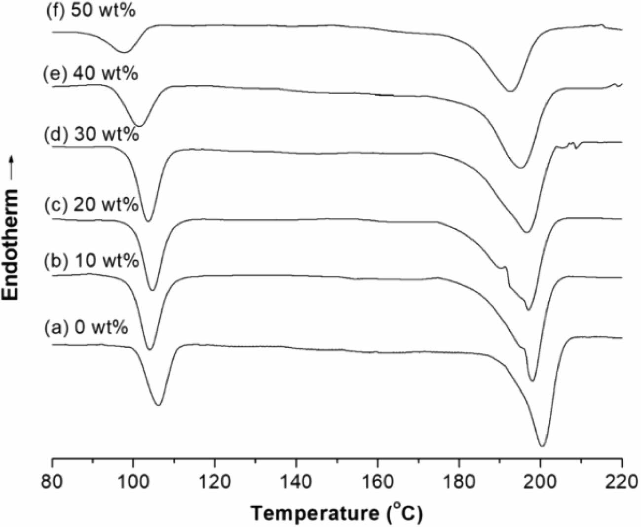 Figure 6 shows the DSC cooling curves for the composites, including those of pure PMP/PP, using a -10 °C/min cooling rate. In the absence of MDH, two exotherms are present, which correspond to the sequential crystallization of PMP (at 204.9 °C) and PP (at 107.3 °C). The observed Tc values of both the PP and PMP phases in the composites decreased progressively with increasing MDH content. The drop in Tc of the PMP/PP/MDH composites with the addition of MDH suggests that it hindered the crystal growth. Additionally, multiple crystallization peaks of PMP phase appeared when 10 and 20 wt% MDH were added, which was attributed to the formation of different morphologies of the same type of crystallite.