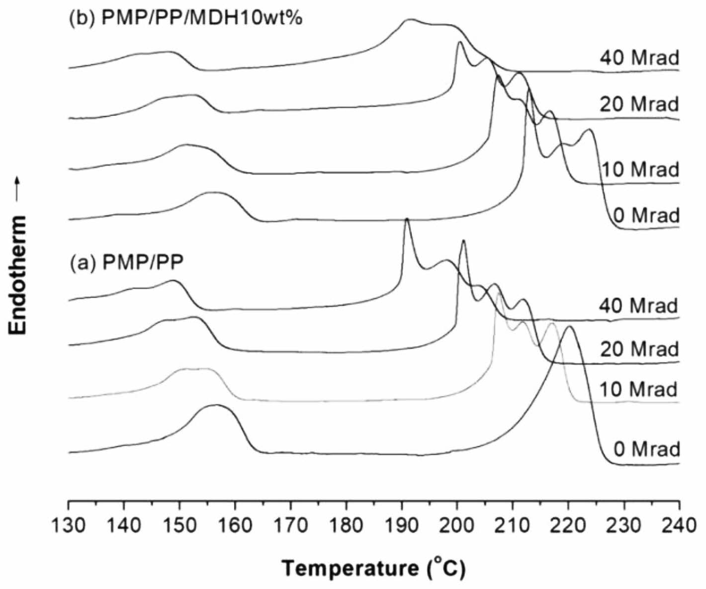 Figure 7 illustrates the second-scan DSC thermograms of the PMP/PP and PMP/PP/MDH10wt% samples as a function of the EB-irradiation dose. The second-scan DSC thermograms of the PMP phase in EB-irradiated PMP/PP (Figure 7(a)) and PMP/PP/MDH10wt% (Figure 7(b)) exhibited triple endotherms. In addition the melting peaks of the PP phase of all EB-irradiated samples were split into two peaks. Crosslinking and chain scission reactions may occur in the PMP/PP sample during EB irradiation. Crosslinking and scission occur at the same time where one may predominate over the other, depending upon the irradiation dose and polymer.12 When the film samples were irradiated by intermediate doses in air, the EB irradiation enhanced the crosslinking degree of the polymer chains, which resulted in a decrease in crystallinity. Crystallization is affected by the presence of crosslinks which reduce the chain mobility and reputation needed for lamellae to form. Consequently, the crosslinked polymer resulted in a lower degree of crystallinity compared to that of the unirradiated polymer. A competing reaction called chain-scission occurs when the polymers are EB-irradiated. In such a case, the polymer chain breaks and the molecular weight decreases. The chain scission process creates shorter polymer chain links, which make it easier to fit into a localized crystalline domain. These meta-stable molecules segregate upon cooling and produce an organized entity. The high-temperature peak may also originate from the melting of more perfect crystals formed through meta-stable phase segregation during the cooling scan.