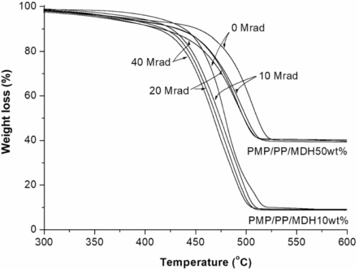 The thermal decomposition curves of the PMP/PP/MDH10wt% and PMP/PP/MDH50wt% composites with different amounts of EB irradiation are shown in Figure 9. Some typical weight loss curves with temperature are shown in the figure. The thermal stabilities of the 10 and 50 wt% MDH filled composites decrease significantly with increasing radiation doses. For PMP/PP/MDH10wt%-40Mrad (T-50%=467.1 °C), the TGA traces show a shift of the weight loss towards lower temperature with stabilization of approximately 12 °C lower than PMP/PP/MDH10wt% (T-50%=479.4 °C). This confirmed that EB irradiation facilitated thermal degradation.