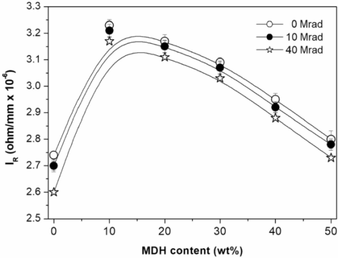 This means that the IR of the PMP/PP/MDH composite is dominated by the electric field at the tip of the defect. The maximum IR value was obtained when the MDH content was 10 wt%. As the MDH loading further increases, the IR value decreases. Micro-structural defects such as voids, cracks, delaminations, and impurities are associated with variations of IR. It is believed that the agglomeration of filler particles creates defect centers that distort and intensify the local electric field, reducing the IR value.5 From Figure 10, all irradiated samples showed lower IR values than unirradiated samples. Crosslinking reactions at high doses occur with chain scission reactions, the latter probably predominate.15 Thus, non-uniformities owing to molecular chain scission introduced into the polymer matrix and polar/ionic products due to EB irradiation cause a decrease in the resistance of the sample.16