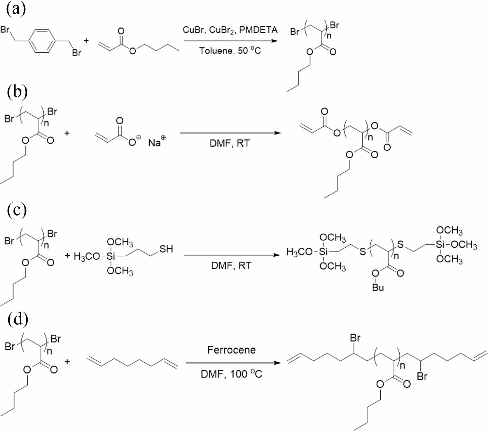 재료. 단량체로 사용된 n-butyl acrylate(BA, 99%, Aldrich, 미국)는 basic aluminum oxide column를 통해 inhibitor를 제거하여 사용하였다. 개시제 1,4-Bis(bromomethyl) benzene(BBMB, 97%), 촉매 copper bromide(CuBr), copper(II) bromide(CuBr2), N-(3-Dimethyl aminopropyl)-N-ethylcarbodiimide hydrochloride (EDC), and 4-(Dimethylamino) pyridine(DMAP), 2,2′-Bipyridine (bpy), 1,7-octadiene, ferrocene, sodium acrylate, (3-mercapto- propyl)trimethoxy silane들은 모두 Aldrich(미국)사에서 구입하였으며 따로 정제하지 않고 사용하였다. 경화제로는 tert-amyl peroxy-2-ethylhexanoate(Akzo Nobel, 네덜란드)와 benzophenone(Aldrich, 미국)을 사용하였다.합성에서 사용된 용매는 dichloromethane(DCM), tetrahydrofuran(THF), methanol(MeOH), N,N-Dimethylformamide(DMF), anisole이며, 모두 HPLC 등급으로 Aldrich(미국)사에서 구입하였으며 따로 정제없이 사용하였다.