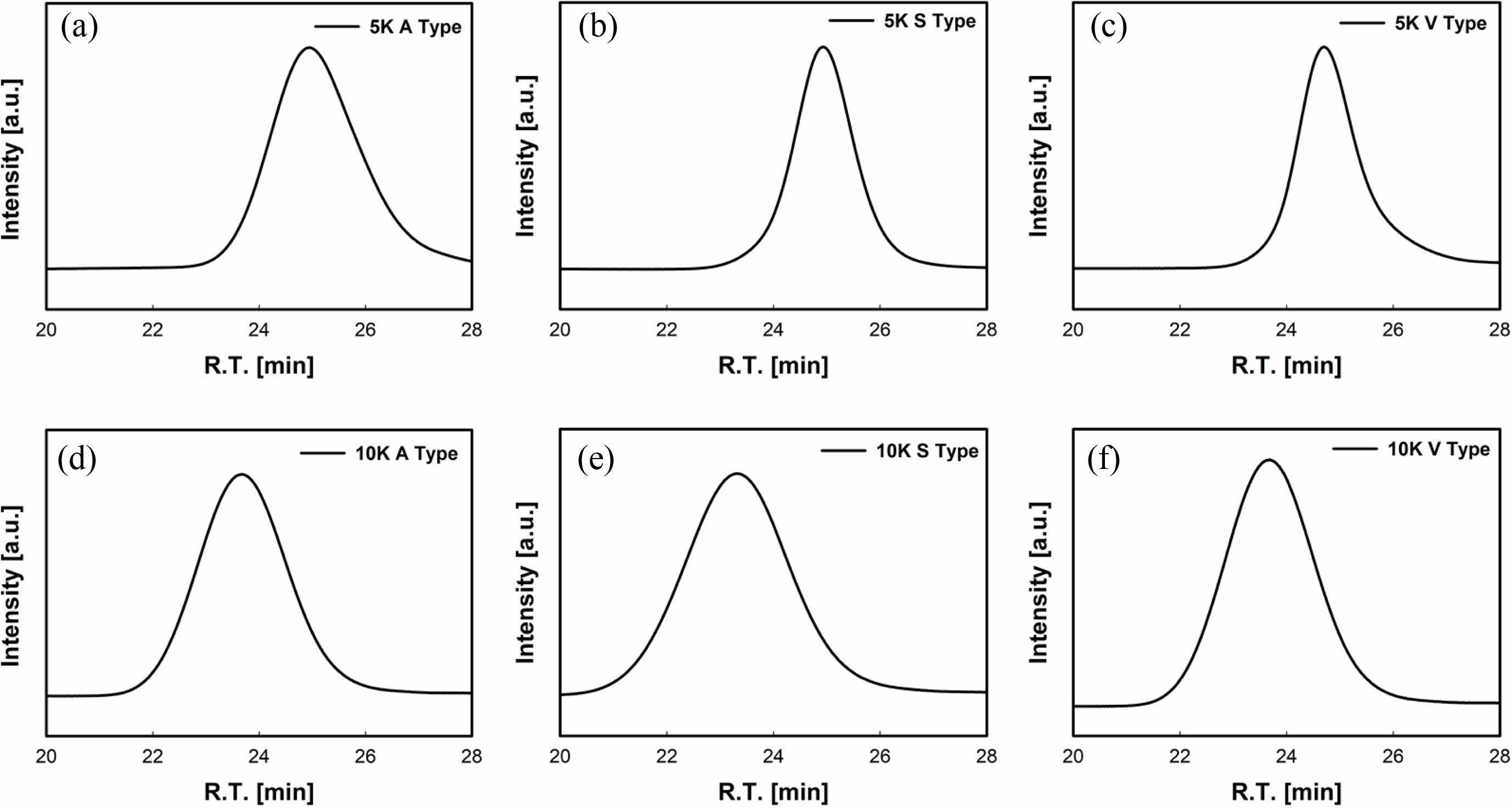 ATRP를 통해 양 말단에 Br을 갖는 PBA 중합을 진행하였다.28,29 PBA는 두 가지 분자량으로 합성하였고, 분자량 분산도와 분자량을 GPC를 통해 분석하였다(Figure 2). 먼저 합성된 PBA는 A, S, V 타입에 대해 각각 분자량 분산도 1.31, 1.35, 1.33을 가지며 분자량은 약 5000 g/mol로 합성된 것이 확인되었다. 분자량에 의한 물성 변화를 확인하기 위해 10000 g/mol의 분자량을 목표로도 합성을 진행하였으며, 이 역시 1.5 미만의 분자량 분산도를 가지며 10000 g/mol 근처의 분자량을 갖는 것을 확인하였다(Table 1).