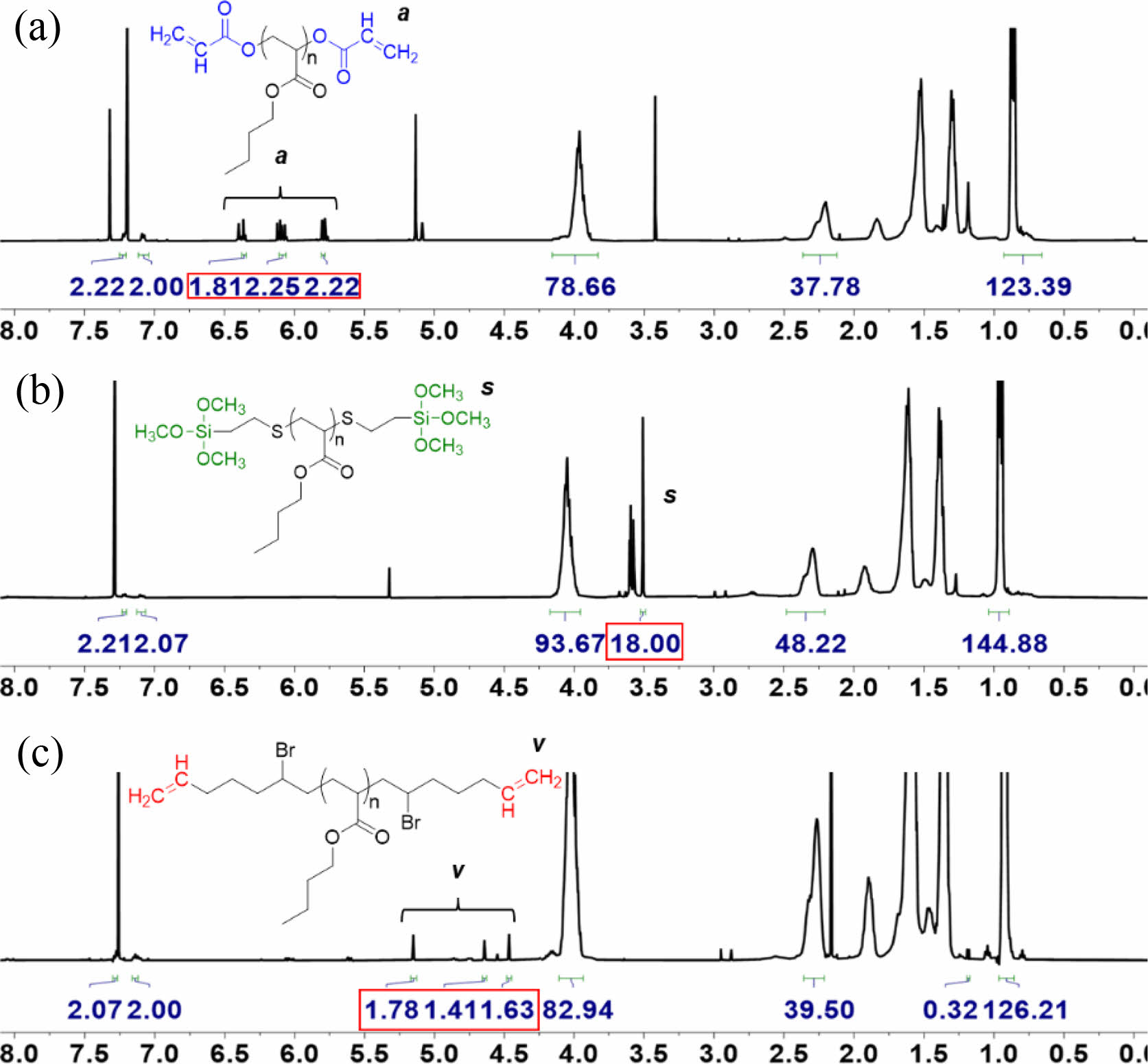 그 후 양 말단기를 경화 가능한 3가지 구조인 아크릴기, 실란기, 비닐기 구조로 치환 반응을 진행하였다.30 먼저 아크릴기를 갖는 A 타입의 경우 sodium acrylate와 Br의 반응을 통해 치환을 진행하였다. Figure 3(a)에서 NMR 분석을 통해 5.7-6.5 ppm에서의 적분 값이 약 6에 해당하며 아크릴기의 수소의 수 3의 2배에 해당하는 것을 확인할 수 있다. 이는 양말단기 수소 숫자인 6과 거의 같으므로 치환 반응이 ~100%로 진행된 것을 확인할 수 있다. 실란기 S 타입의 경우 thiol과 Br의 반응을 통해 말단기 치환을 진행하였다. Figure 3(b)에서 3.5 ppm에 해당하는 적분 값이 18인 것을 확인할 수 있다. 이는 silane 기의 수소의 수인 9의 2배에 해당하며, 양 말단기가 성공적으로 100% 치환된 것을 확인할 수 있다. 마지막으로 비닐기 V 타입으로의 치환 반응은 ferrocene 촉매를 사용하여 Br과 이중 결합의 반응을 통해 치환을 진행하였다. 이 역시 Figure 3(c)에서 4.5-5.3 ppm의 피크 적분값을 확인해보면 그 값이 4.82인 것을 확인할 수 있다. 이는 양 말단기 vinyl기의 수소의 수의 합인 6에 80%에 해당하는 값으로, 이를 통해 말단기 치환이 약 80% 진행된 것을 확인할 수 있다.