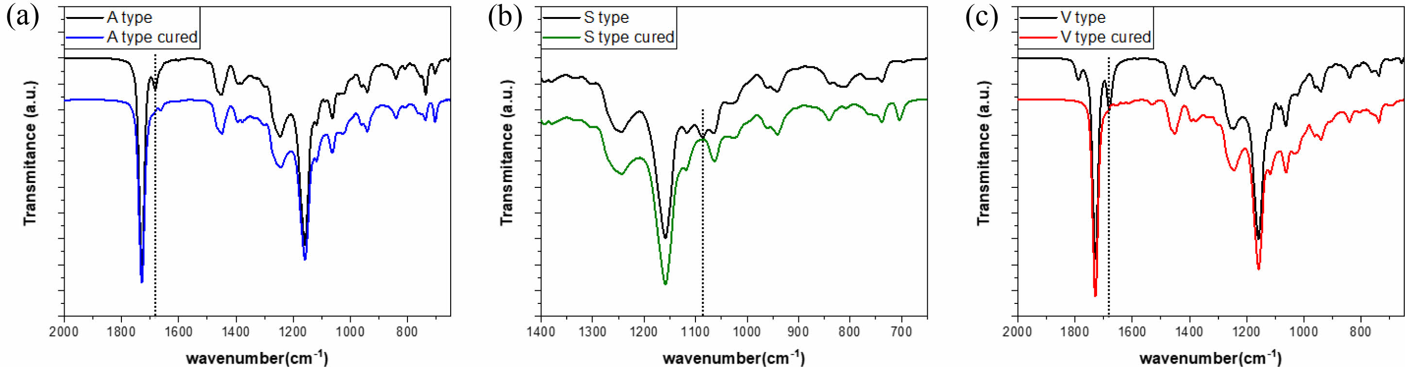 경화 전후의 변화를 FTIR을 통해 확인하였다. A, S 타입은 Figure 4(a), (c)에서 볼 수 있듯이 경화 전 1680 cm-1 근처에서 나타나던 CH2=CH 피크가 경화 후 사라지는 것을 확인하였다.26 S 타입의 경우 Figure 4(b)에서 경화 전에 1080 cm-1 근처에서 나타나던 Si-O-CH3 피크가 경화 후 사라지는 것을 확인하였다. 이를 통해 모든 경화 방식에서 경화가 잘 이루어졌음을 확인하였다.27