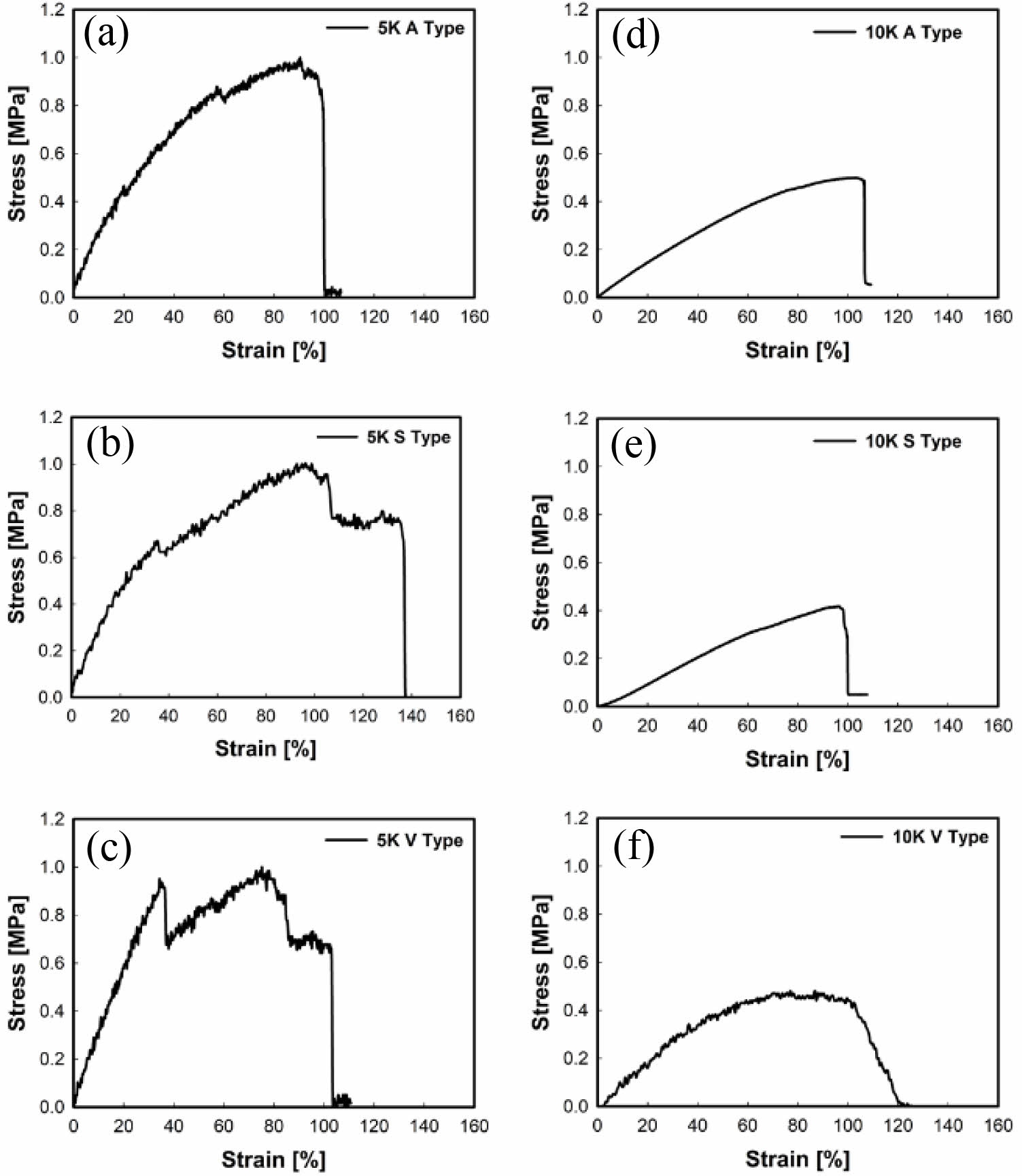 Figure 5 Tensile strengths of (a) 5K A type PBA; (b) 5K S type PBA; (c) 5K V type PBA; (d) 10K A type PBA; (e) 10K S type PBA; (f) 10K V type PBA. |