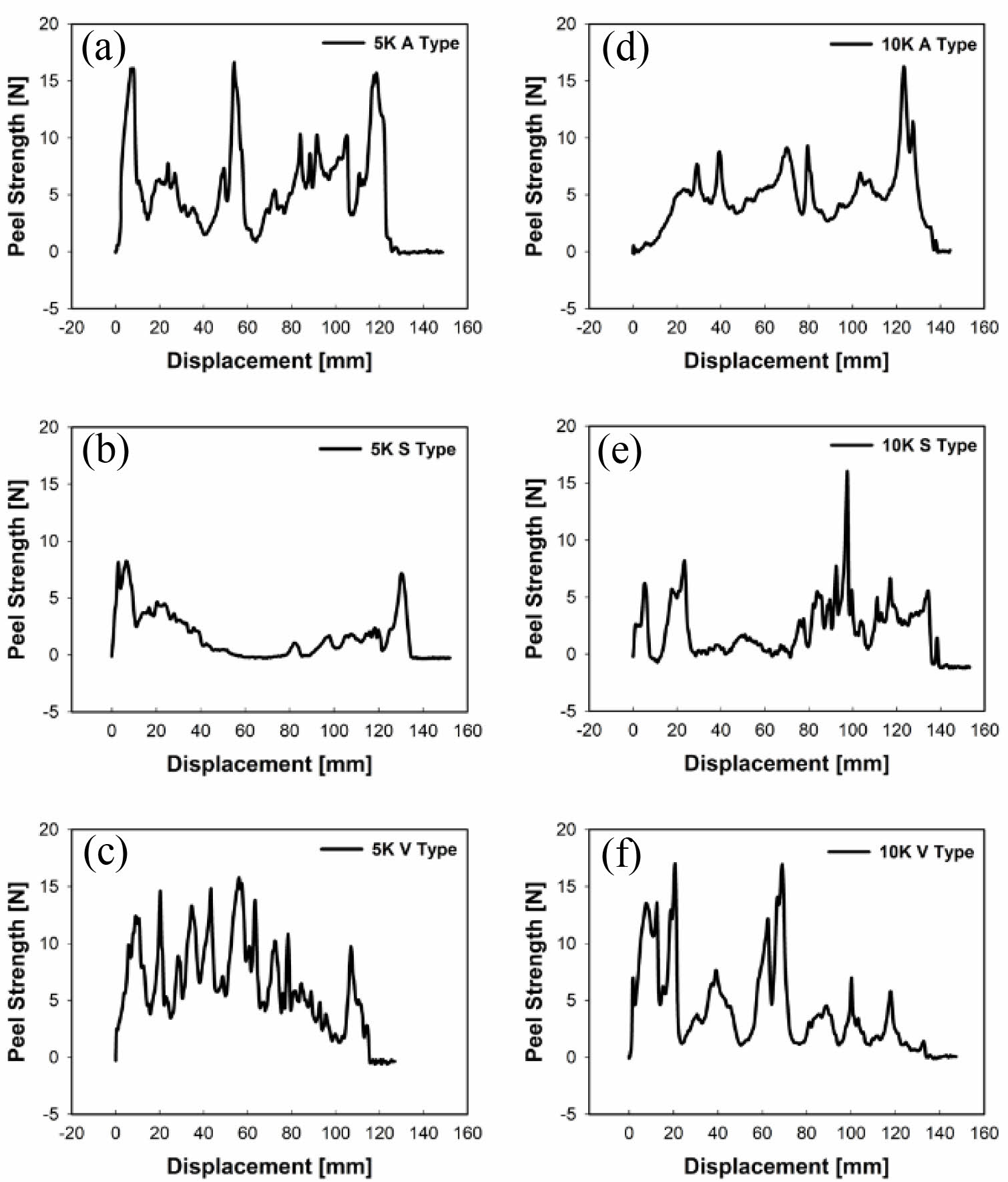 Figure 6 Peel strengths of (a) 5K A type PBA; (b) 5K S type PBA; (c) 5K V type PBA; (d) 10K A type PBA; (e) 10K S type PBA; (f) 10K V type PBA. |