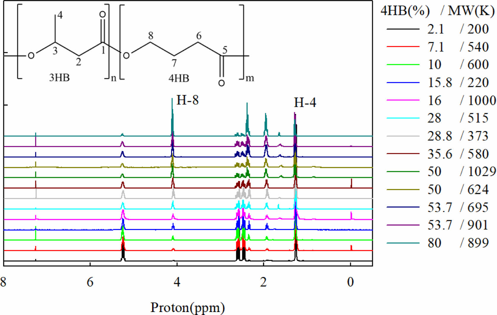 P(3HB-co-4HB)의 화학구조. Figure 2는 본 연구에서 사용된 P(3HB-co-4HB)의 1H NMR spectra 결과이다. Figure 1의 P(3HB-co-4HB) 화학구조에서 1.25 ppm에서 3HB의 4번 위치의 수소 피크와 4.1 ppm에서 나타나는 4HB의 8번 위치의 수소 피크 면적이 사용된 P(3HB-co-4HB) 종류에 따라 변화됨을 확인하였고 이로부터 P(3HB-co-4HB)의 4HB 함량을 확인할 수 있다. 이러한 결과로부터 미생물에 의하여 다양한 4HB 함량을 갖는 P(3HB-co-4HB)가 생성됨을 알 수 있었다.