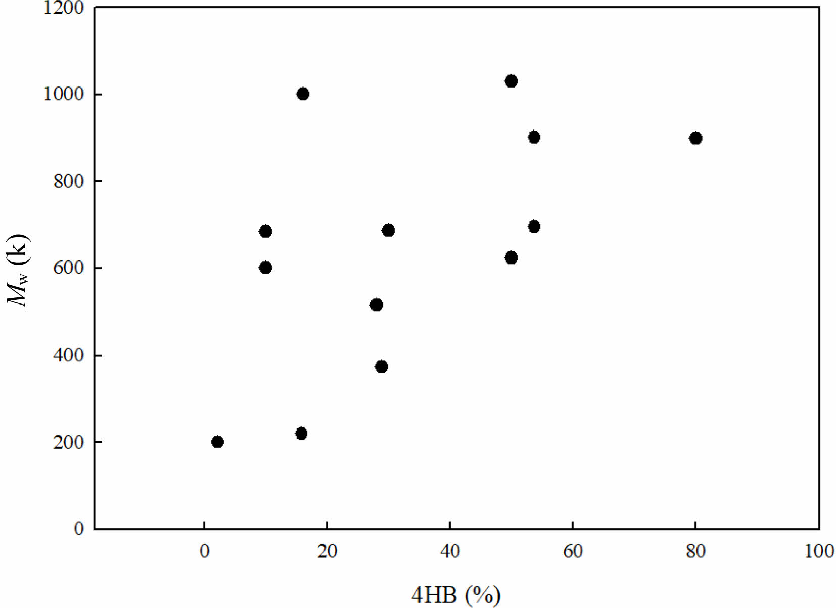 Figure 3 Relationship between 4HB content and molecular weight of P(3HB-co-4HB). |