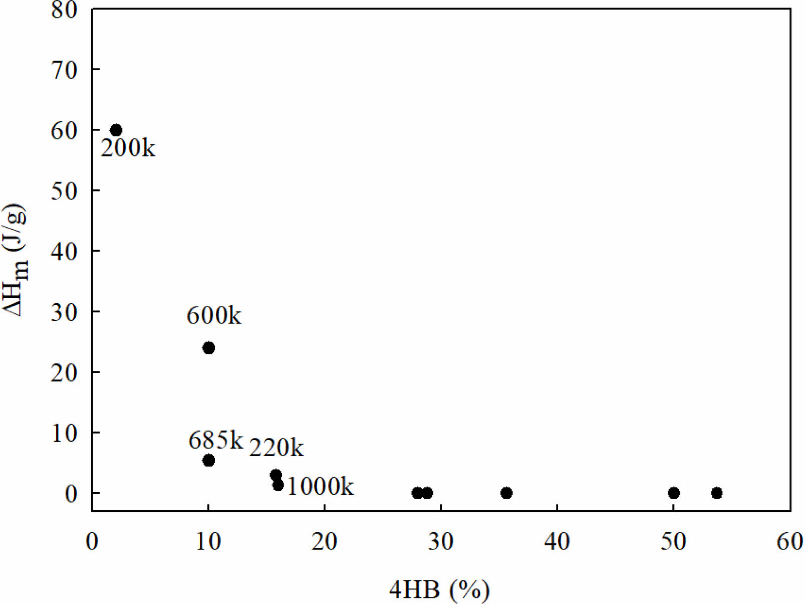 Figure 5에 P(3HB-co-4HB) 용융 엔탈피를 4HB의 함량과 분자량에 따라 나타내었다. 그림에서 보는 바와 같이 4HB 함량과 분자량 증가에 따라 용융 엔탈피가 감소함을 알 수 있다. 4HB 함량이 2.1% 일 때 용융 엔탈피가 59.97 J/g인 반면, 4HB 함량이 10%로 증가되면 용융 엔탈피는 절반 이하로 줄어들며, 16%에서는 1/10 수준으로 떨어지는 것을 확인할 수 있다. 이러한 결과는 본 연구에서 사용한 P(3HB-co-4HB)는 random copolymer로31 4HB 함량 증가는 copolymer의 randomness를 증가시켜 3HB와 4HB사슬에 의한 결정화를 방해한다. 일정량(28%) 이상의 4HB 함량을 가지면 P(3HB-co-4HB)는 결정화가 어려워 비결정 구조를 가짐을 알 수 있다.
