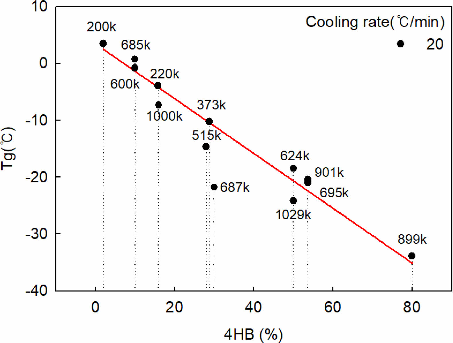 Figure 6은 4HB 함량에 따른 P(3HB-co-4HB)의 유리전이온도 변화이다. 4HB 함량이 증가하면 유리전이온도가 현저하게 낮아지며 선형적인 상관관계를 가짐을 알 수 있다. 유리전이온도는 비정형 사슬 거동을 나타낸다. P(4HB)는 유리전이온도가 -50 oC로 탄성적인 기계적 물성을 가지는 것으로 알려져 있는32 반면 P(3HB)는 유리전이온도가 4 oC로 상대적으로 높으며 낮은 결정화 속도에 의하여 구정 성장이 완벽하게 이루어져 구정들의 impinging 계면 형성에 의하여 brittle한 물성을 갖는다. 이들의 공중합체인 P(3HB-co-4HB)는 4HB 함량 증가에 따라 사슬의 random 화가 가속화되어 결정성이 감소된다. 또한 공중합체 내에 비정형 영역이 증가되어 유리전이온도가 감소되며 상대적으로 유연한 4HB 사슬이 공중합체에 많아져 이들의 유연성에 의해서도 유리전이온도가 감소가 된다. 일반적으로 분자량이 증가되면 사슬과 사슬 간의 van der Waals 결합이 증가되어 비정형 사슬이 운동성이 감소되어 유리전이온도가 증가할 것으로 예측된다. 하지만 4HB 함량 증가에 따른 분자량 증가는 앞에서 언급한 비정형 사슬의 증가와 이들의 유연성 증가에 의하여 분자량 증가보다는 4HB 함량에 더 의존적임을 알 수 있다.