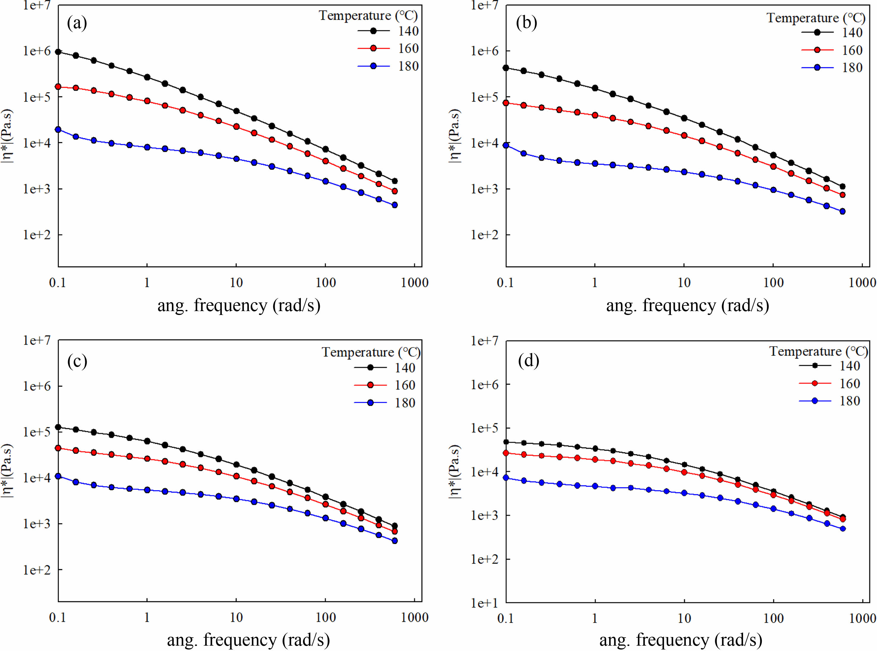 Figure 7 Complex viscosity vs. shear rate of P(3HB-co-4HB) with various 4HB content: (a) 10%; (b) 16%; (c) 30.6%; (d) 53.7% |