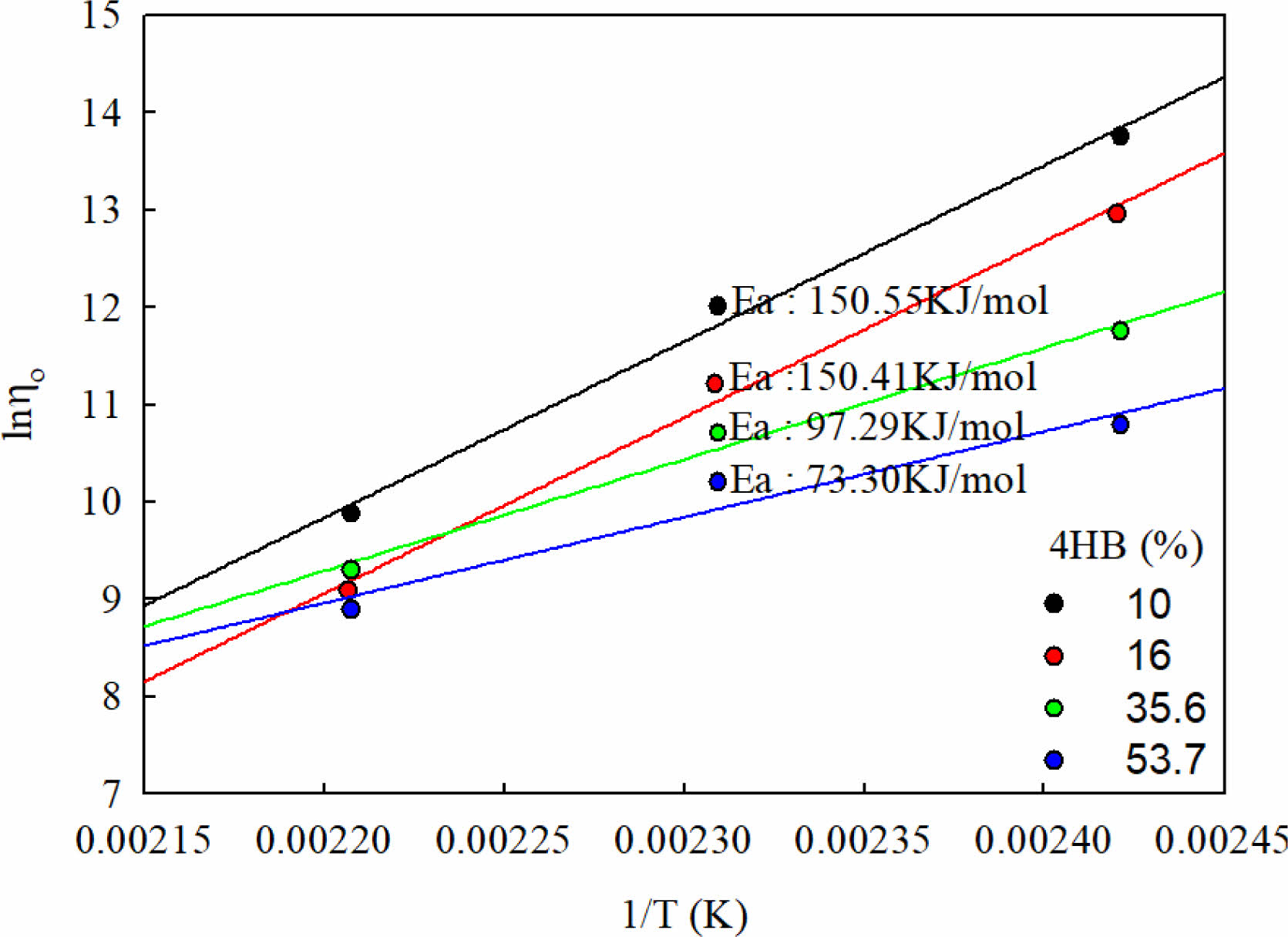 4HB 함량이 10%와 16%는 유사한 activation energy를 가지며 35% 이상에서 4HB 함량이 증가할수록 activation energy가 감소하는 것을 확인할 수 있다. Activation energy는 사슬의 움직임에 필요한 에너지를 의미한다. 따라서 높은 activation energy를 갖는다는 것은 사슬의 움직임에 많은 에너지가 필요함을 의미한다. 즉, 4HB 함량이 작아 결정성을 유지하는 P(3HB-co-4HB)는 사슬 움직임이 어려우며 10%와 16%의 함량에 따라 큰 차이가 없다. 반면, 높은 4HB 함량을 가져 비결정성을 유지하는 P(3HB-co-4HB)의 경우 activation energy의 감소가 커 사슬 움직임이 상대적으로 용의함을 알 수 있어 4HB의 함량이 증가되면 사슬의 움직임이 더 좋아짐을 알 수 있다. 즉, 4HB 함량 증가에 의하여 P(3HB-co-4HB)의 주사슬 유연성이 증가되어 점도는 감소하며 점도의 온도에 따른 변화가 작아짐에 따라 온도에 따른 용융 가공 원도우는 좁아짐을 알 수 있다.