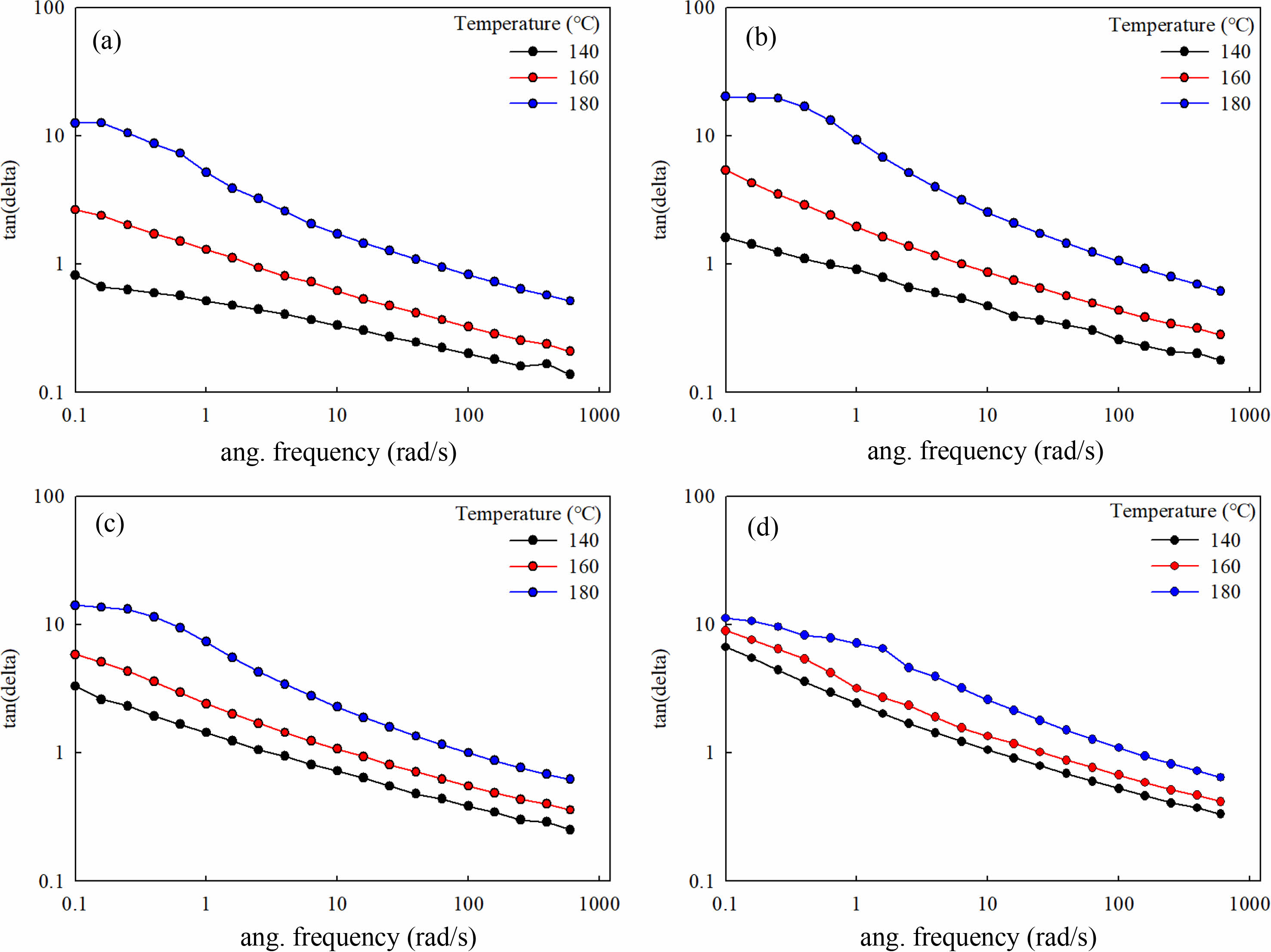 Figure 9는 4HB 함량과 온도에 따른 P(3HB-co-4HB)의 tanδ 변화이다. Loss tangent는 dynamic viscosity(η′)와 storage viscosity(η″)의 비를 나타낼 수 있으며 고분자 가공 특성에서 중요한 지표로 사용되는 melt strength와 밀접한 관계가 있다. Loss tangent와 melt strength는 반비례 관계를 가지고 있어 loss tangent 증가는 melt strength의 감소를 의미한다. 고분자의 용융가공에서 고분자는 용융 상태의 고분자에 응력을 가하여 특정 모양으로 성형하게 된다. 이때 melt strength가 낮아지면 힘에 의한 모양 성형이 어려워진다. 반면 너무 높은 melt strength는 용융 파단과 같은 문제점을 일으켜 가공성을 저하시킴에 따라 용융 가공은 적절한 melt strength를 갖는 재료와 가공 조건이 필수적이다. 그림에서 보는 바와 같이 P(3HB-co-4HB)는 낮은 가공 온도(140 oC)에서 4HB 함량이 낮을수록 loss tangent가 감소되는 것을 알 수 있다. 따라서 P(3HB-co-4HB) 가공성 증가를 위해서는 낮은 가공온도에서 4HB의 함량이 낮은 P(3HB-co-4HB)를 사용하는 것이 좋을 것으로 판단된다. 가공 온도에 따른 loss tangent의 온도 의존성은 낮은 4HB 함량에서 높아진다. 따라서 용융가공 시 4HB가 낮은 P(3HB-co-4HB)를 사용할 경우, loss tangent의 변화를 최소화하기 위하여 일정한 온도 유지가 매우 중요함을 알 수 있다. 하지만 앞에서 언급된 바와 같이 낮은 4HB 함량을 가진 P(3HB-co-4HB)는 사슬 유연성이 적음에 따라 용융 가공에 적절한 4HB 함량의 선정이 중요함을 알 수 있다.
