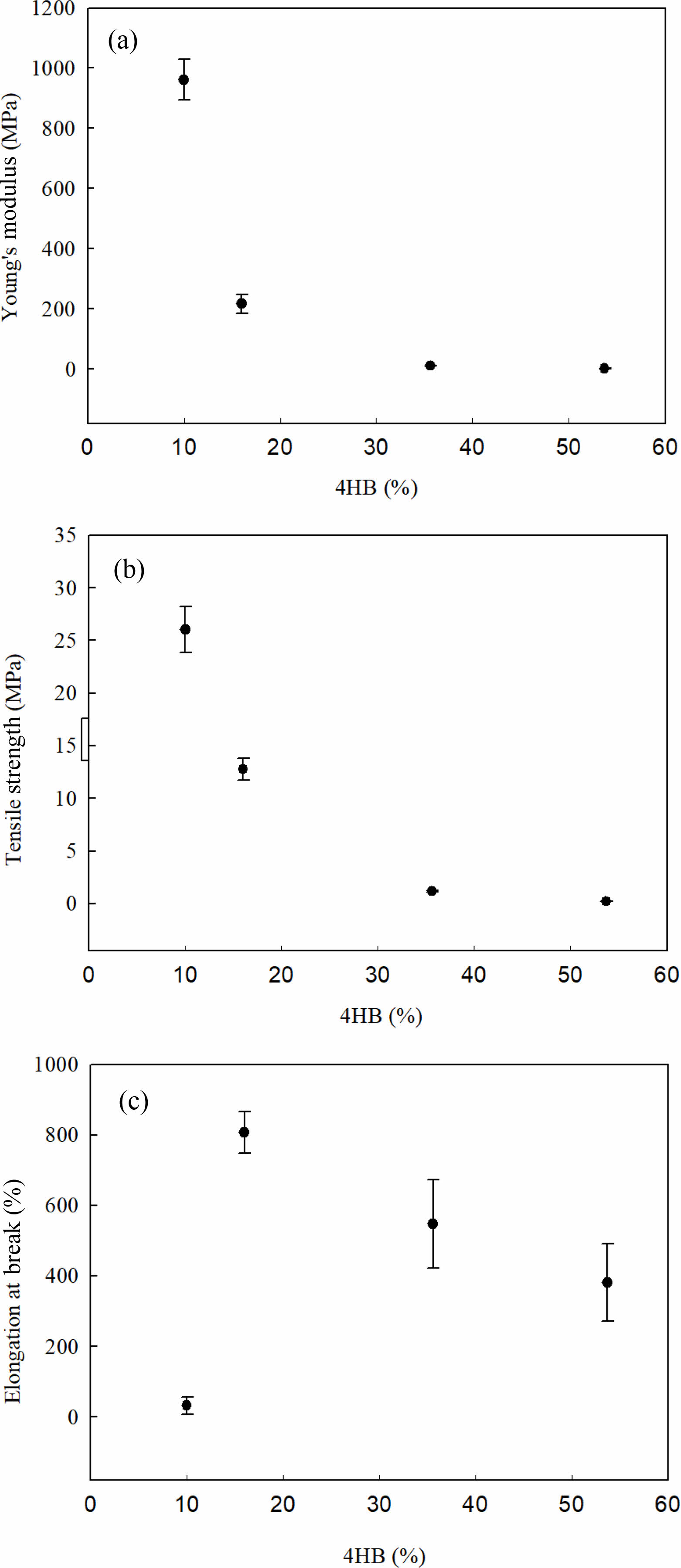 Figure 11 Effect of 4HB content on mechanical properties P(3HBco-4HB): (a) Young’s modulus; (b) tensile strength; (c) elongation at break. |