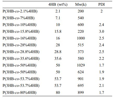 대표적인 PHA로 다양한 박테리아로부터 생성되는 PHB는 규칙적인 stereoregularity에 의하여 높은 결정화도, 큰 구정 그리고 지속적이고 느린 결정성장에 의하여 매우 brittle한 물성을 가지며 용융가공 시 열분해가 큰 문제점을20 갖는다. 이를 해결하는 방법으로 PHB 주사슬에 다양한 hydroxyalkanoate가 포함된 공중합체를21 만들거나 상호에스테르 결합을 이용하여 주사슬을 변형하는 방법22 그리고 다른 생분해성 고분자의 블렌드 등이23,24 고려될 수 있다. 이 중 가장 효과적인 방법으로 3-hydroxyvalerate(3HV)를 이용하여 P(3HB-co-3HV)를 제조하는 연구가25 진행되었으며 이와 함께 4-hydroxybutyrate(4HB)를 이용하여 poly(3-hyroxybutyrate-co-4-hyroxy- butyrate)(P(3HB-co-4HB))를 Ralstonia eutropha, Alcaligenes latus, Comanonas acidovorans와 같은 박테리아로 만드는 연구가26 진행되었다. 특히 brittle한 특성의 개선을 위한 이들의 결정화거동 연구와27,28 가공 특성 개선을 위한 유변 특성 연구가29,30 많이 이루어지고 있다.