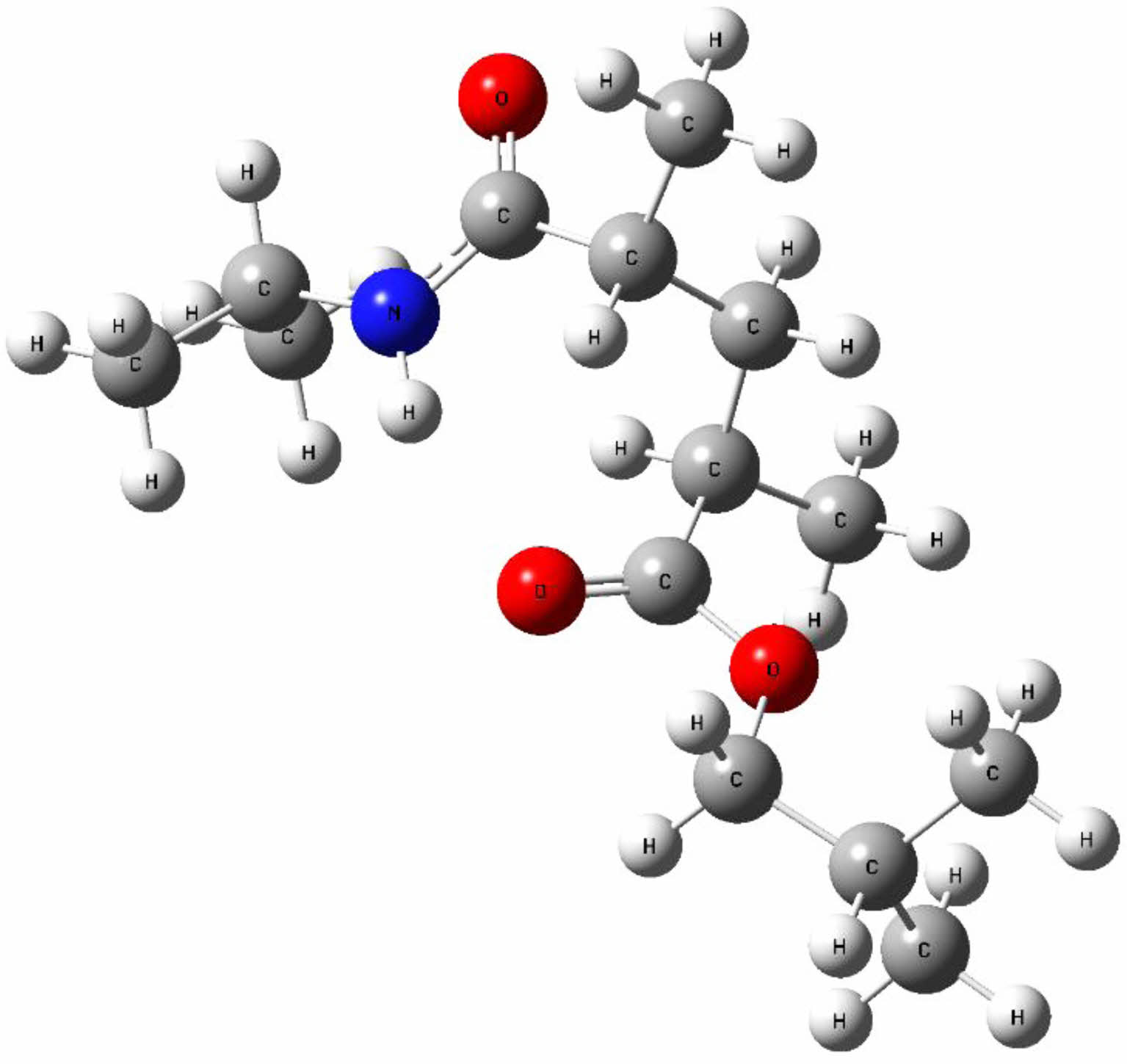 Molecular Structure. Changes in the energy and other properties of molecules are caused by structural and positional changes. The molecule's approximate most stable structure is obtained by geometric optimization. As a result, a stable, low-energy molecule structure is found. Figure 2 shows the theoretical geometric structure of poly(NIPAM-co-BtMA), which was determined by doing the necessary calculations for just one unit.