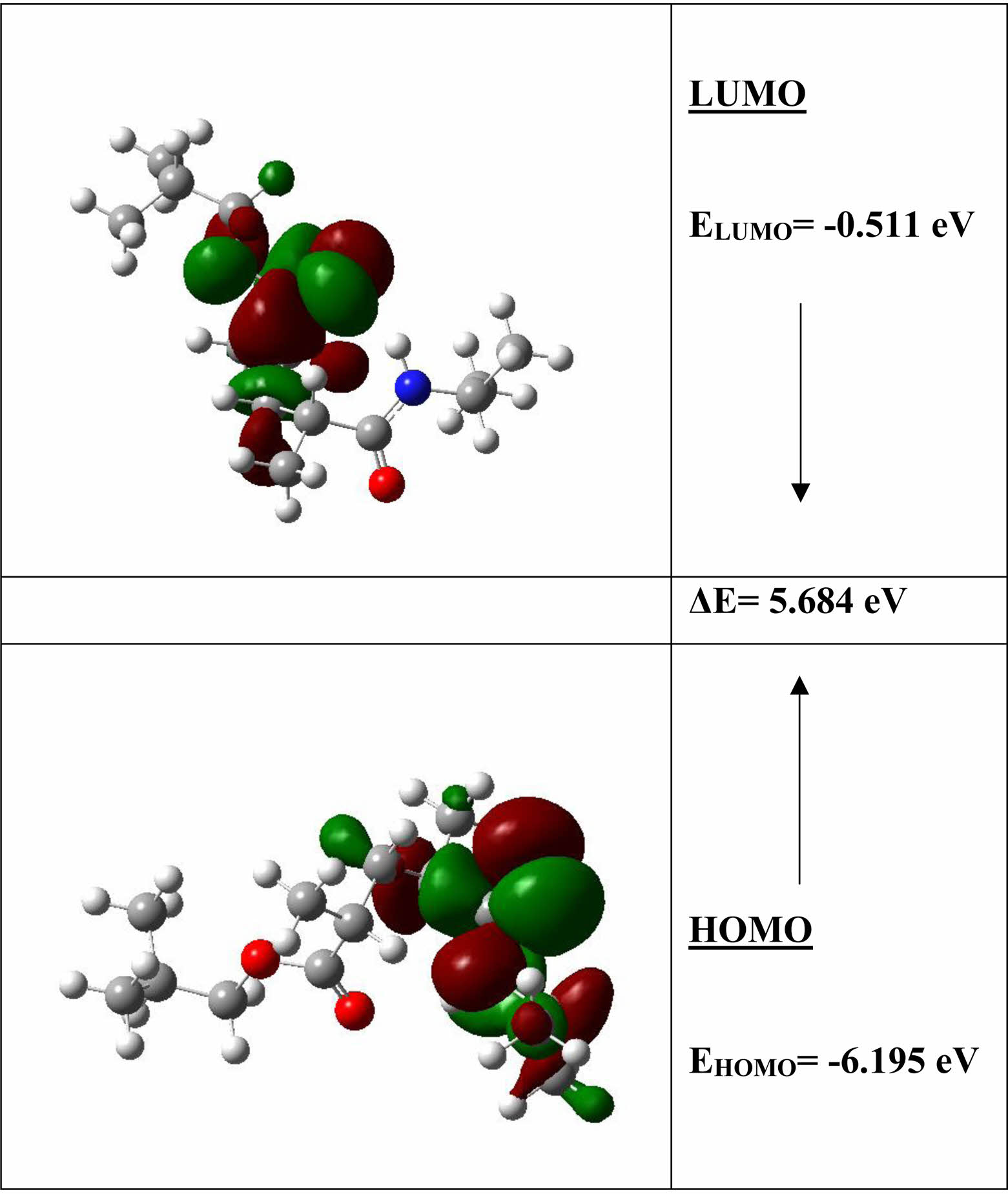 Figure 3 Three-dimensional representation of HOMO and LUMO molecular orbitals of molecule and their energy values. |