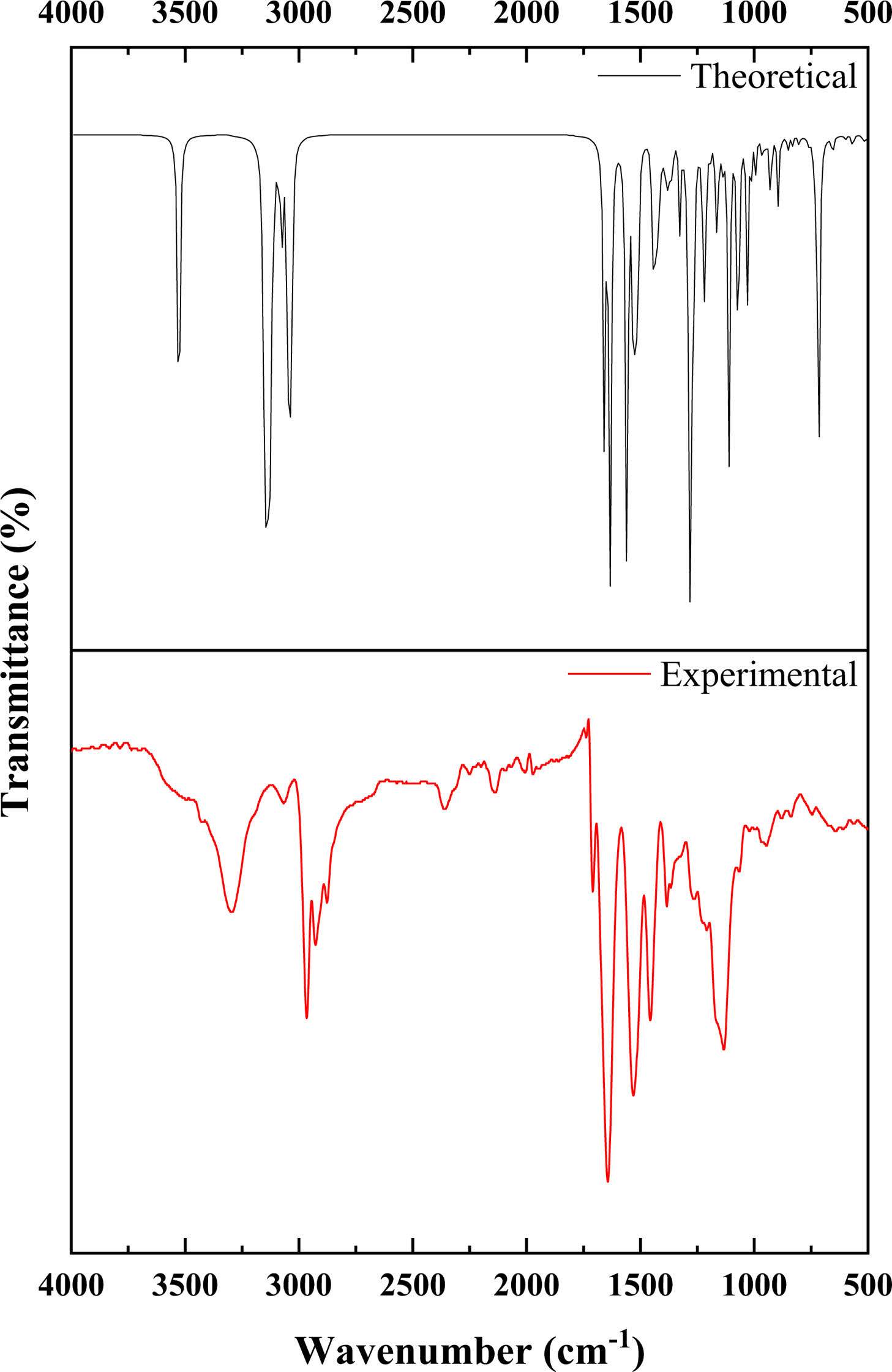 Figure 4 Experimental and theoretical FTIR spectra of poly (NIPAM-co-BtMA). |