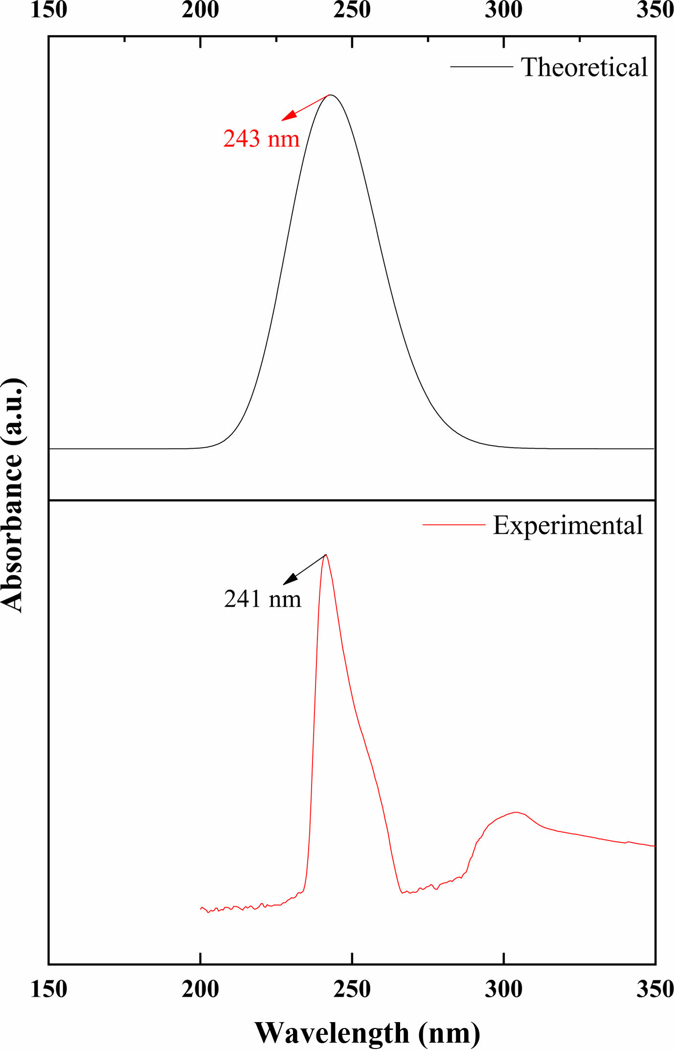 UV-Vis Absorption Analysis. UV-vis spectroscopy of poly (NIPAM-co-BtMA) was investigated both experimentally and theoretically. Experimental UV-vis spectrum of poly (NIPAM-co-BtMA) was recorded in the range of 150 and 350 nm in dichloromethane solution with PerkinElmer Lambda 45 UV/VIS spectrometer. In terms of theoretical calculations, time-dependent density functional theory (TD-DFT) is the most common method for predicting electrically excited states and explaining UV-Vis spectra. In this case, the TD-DFT approach was used to calculate oscillator strengths, vertical excitation energy, and wavelengths of our calculated results of the title molecule. A solvent effect is particularly significant in analyzing UV-vis spectrum data because the solvents might link together in hydrogen bonds, leading to strong inter- or intramolecular interactions. Theoretical calculations for UV-vis were performed using TD-DFT/B3LYP with 6-31G basis set in dichloromethane solution. Both experimental and theoretical computed UV-vis spectra of poly (NIPAM-co-BtMA) are shown in Figure 5. The strong absorption maxima for poly (NIPAM-co-BtMA) were determined at 241nm and 243nm experimentally and theoretically, respectively, as shown in Figure 5.