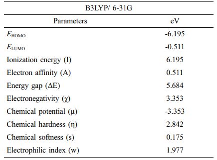 HOMO-LUMO Analysis and Electronic Properties. The highest occupied molecular orbital (HOMO) and the lowest unoccupied molecular orbital (LUMO) energies are the most well-known quantum chemical parameters. These orbitals, which are also referred to as frontier molecular orbitals, are crucial in determining both the electronic and optical properties of a molecule, particularly in chemical reactions. Figure 3 depicts the HOMO and LUMO surfaces and energies of the investigated structure. The HOMO energy is a measure of a molecule's ability to donate electrons and is related to its ionization potential. Moreover, the ability of a molecule to gain electrons is represented by LUMO energy, which is directly connected to electron affinity. The energy difference between HOMO and LUMO can be used to calculate a molecule's chemical stability. As can be seen from the figure, the energy difference between HOMO and LUMO is 5.684 eV. The fact that this energy range is wide implies that the molecule is in a stable state. The HOMO and LUMO energies were also used to compute electronegativity, chemical potential, chemical hardness, and chemical softness. Table 1 lists these molecules electrical characteristics. The molecule is extremely stable, with negligible chemical reactivity and great kinetic stability, as shown in Table 1.