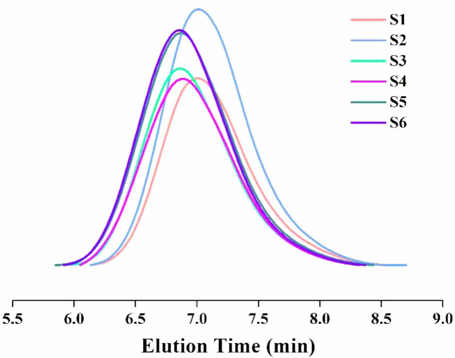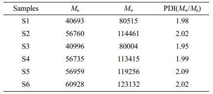 GPC. Figure 2 was the GPC curves of S1-S6 copolymerization films, and it could be seen that the MWD of the synthesized ternary copolymer was unimodal without side reaction products (such as oligomer) detected. The experimental data were listed in Table 2. The MWD of S2-S6 was similar to that of S1. The Mw of the S1 was 80515 g/mol and its Mn was 40693 g/mol with a polydispersity index (PDI=Mw/Mn, an indicator of MWD) of 1.98. The molecular weights (Mw) of films S2-S6 were almost the same as that of film S1. The values of PDI of S1, S3, and S4 were 1.98, 1.95, and 1.99 respectively (all less than 2.0), indicating that the MWD of the samples was sufficiently narrow.