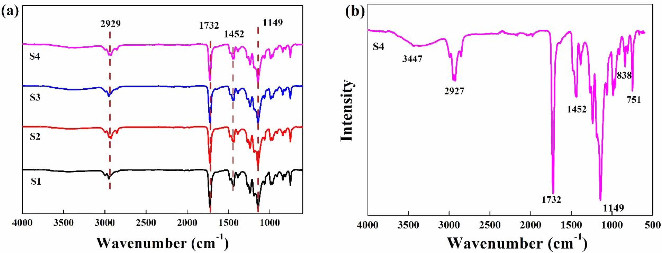 FTIR Analysis. Figure 3showed the infrared spectrum of S1-S6, and the peak at 1733 cm-1 was the stretching vibration characteristic of ester carbonyl group and that at 1452 cm-1 was the asymmetric stretching of PMMA's O-CH3 group.23-30 The peaks at 1149 and 1152 cm-1 were the symmetric stretching vibrations of the carbon-oxygen bond of the ester group,31 and that at 1149 cm-1 was the characteristic peak of the ester bond of MMA.32 The absorption bands peaks at 1461 cm-1 and 1068 cm-1 were closely related to the bending vibrations of the C-H and C-O bonds, respectively. The area change in the vicinity of 3000-2700 cm-1 belonged to the -CH2 of the LMA side chain in the copolymer.33 The peak at 3447 cm-1 was the vibration peak of -COOH, that at 751 cm-1 was the characteristic peak of LMA and that at 838 cm-1 was the characteristic peak of BA. The stretching vibration peak for C=C double bond was usually 1700-1600 cm-1, and this characteristic peak did not appear in the spectrum, indicating the PMMA copolymer had been successfully prepared in this work.34