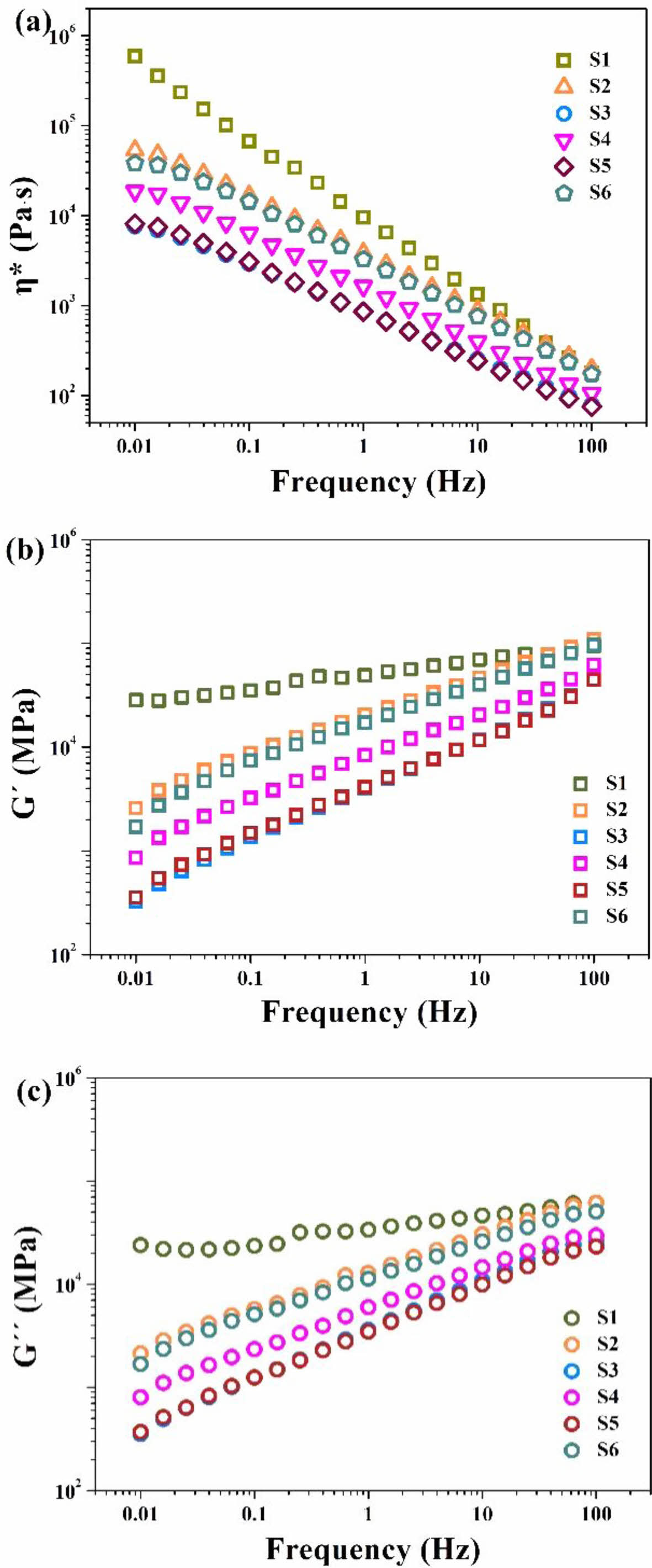 Figure 4 (a) Frequency dependence of complex viscosity; (b) frequency dependence of storage modulus; (c) frequency dependence of loss modulus for PMMA copolymer films. |