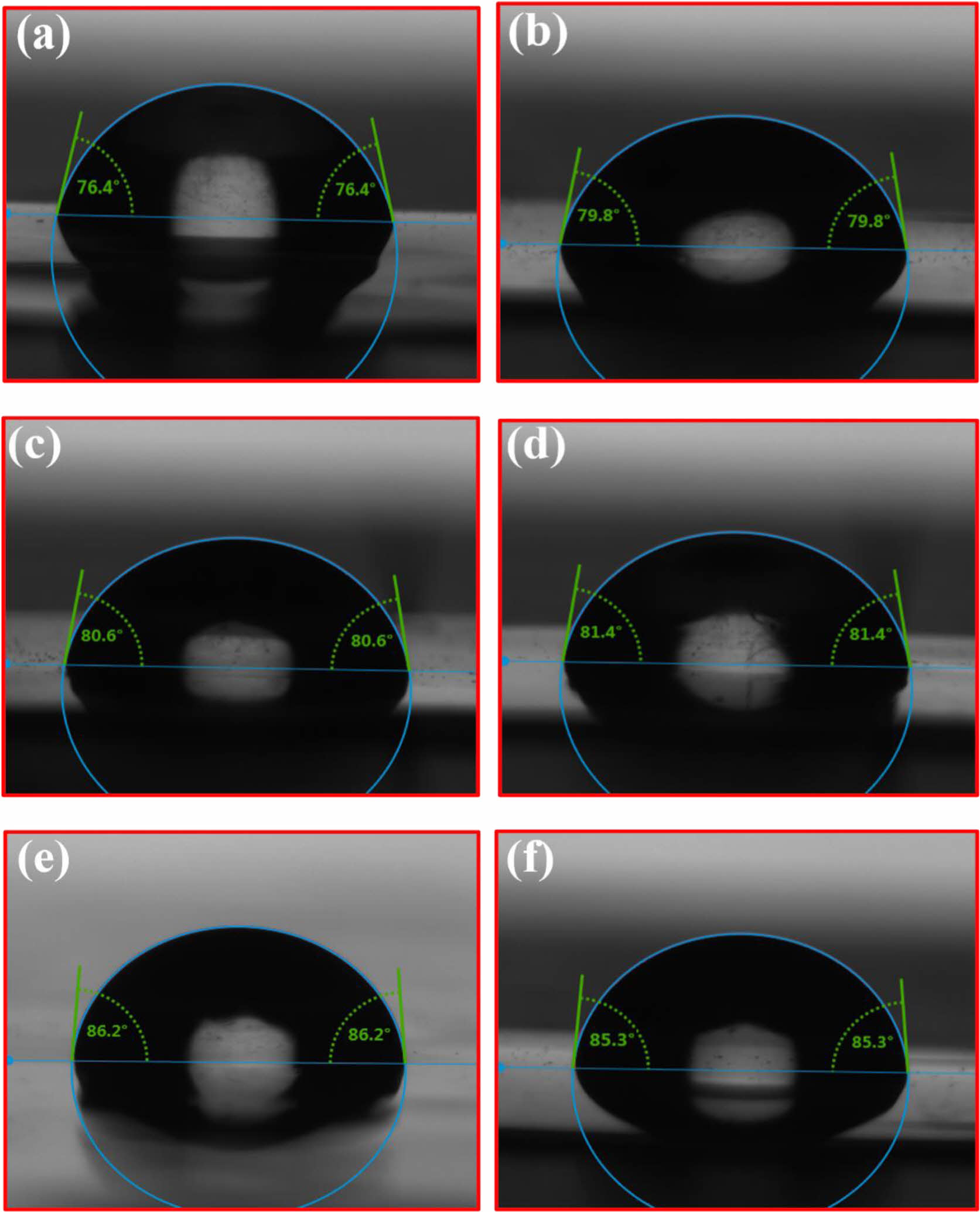 Figure 5 WCA of copolymer films of (a) S1; (b) S2; (c) S3; (d) S4; (e) S5; (f) S6. |