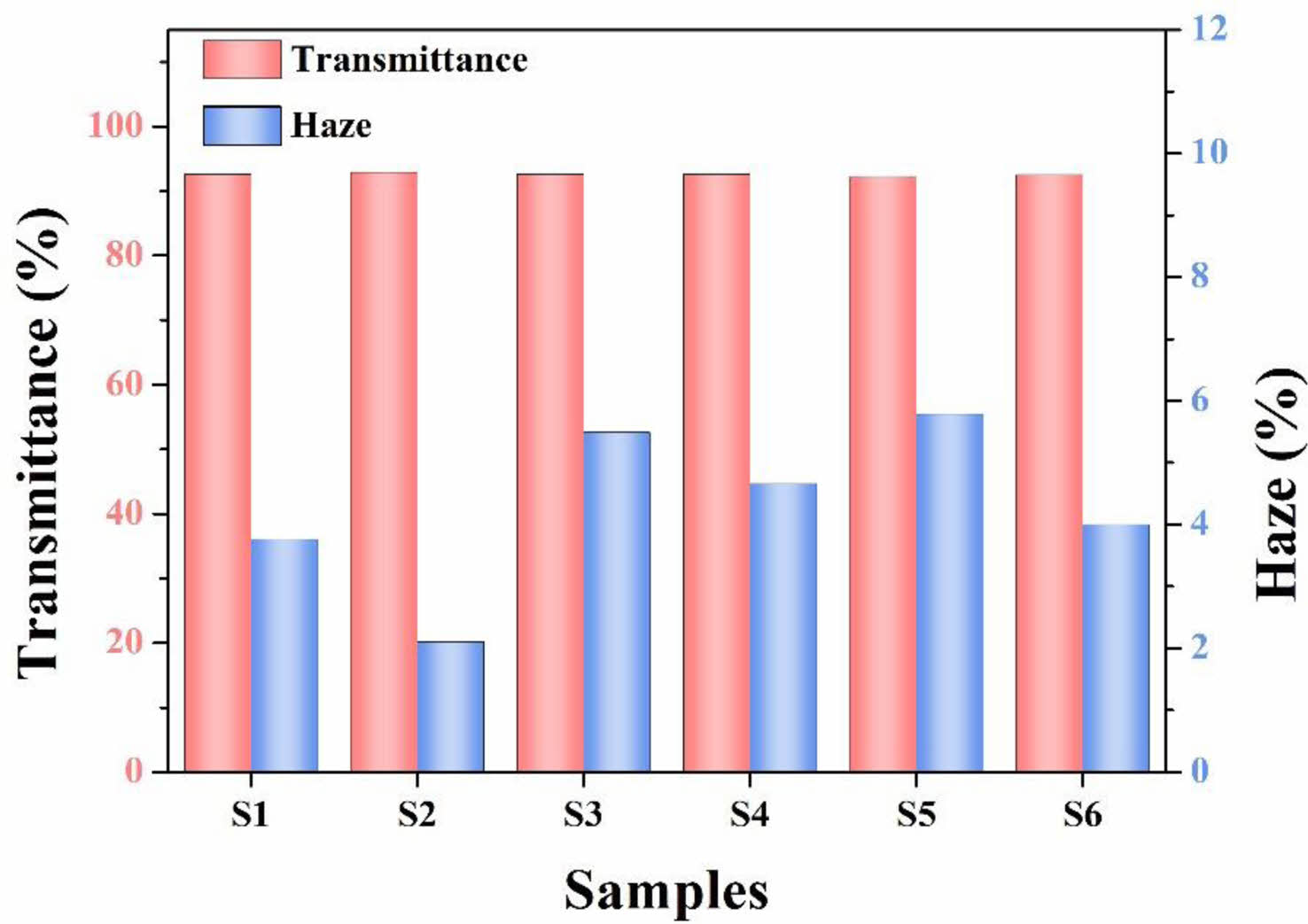 Figure 6 Variation of the transparency and haze test for various samples. |