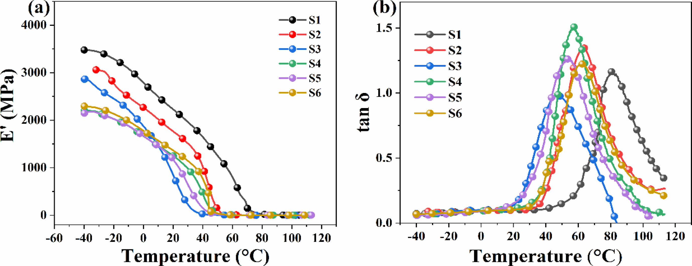The DMTA curves of neat PMMA and copolymer films were shown in Figure 9. In the temperature range studied, the viscoelasticity of the samples varied considerably with the variation of the monomer ratio. As presented in Figure 9(a), the storage modulus decreased as the temperature rose, showing an inverted "S" type. The value of the lower slope in the middle of the storage modulus curve gradually increased, indicating that the temperature sensitivity of the storage modulus increased gradually. It could be seen that the addition of different ratios of monomers caused the storage modulus of copolymer films to be lower than that of neat PMMA film, indicating that the addition of these monomers reduced the rigidity of the film.