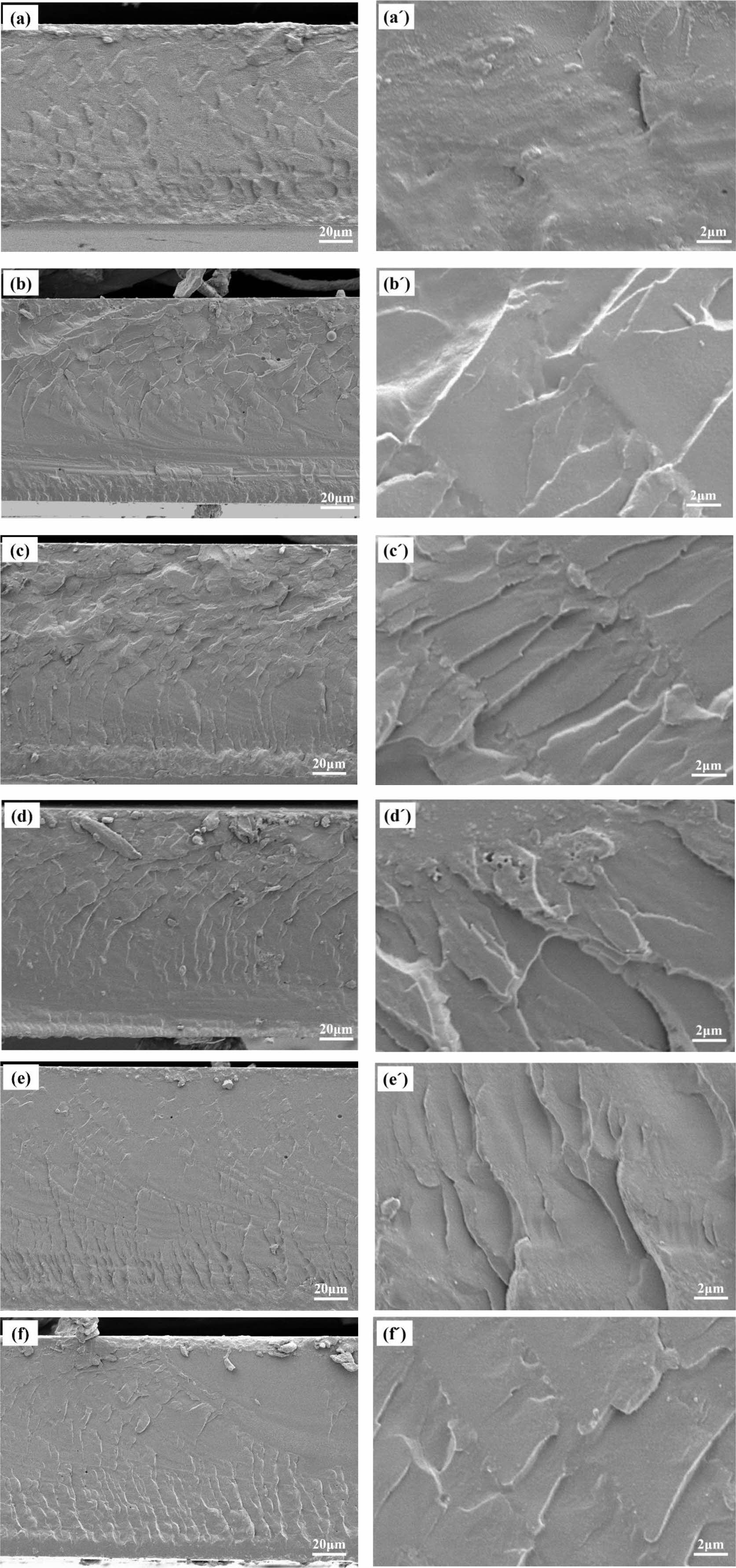 Figure 10 Cross-sectional morphologies of copolymer films at 20 μm and 2 μm: (a-a') S1; (b-b') S2; (c-c') S3; (d-d') S4; (e-e') S5; (ff ') S6. |